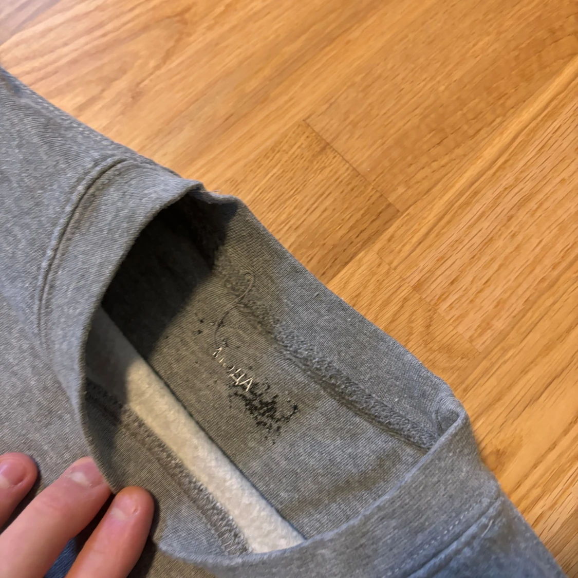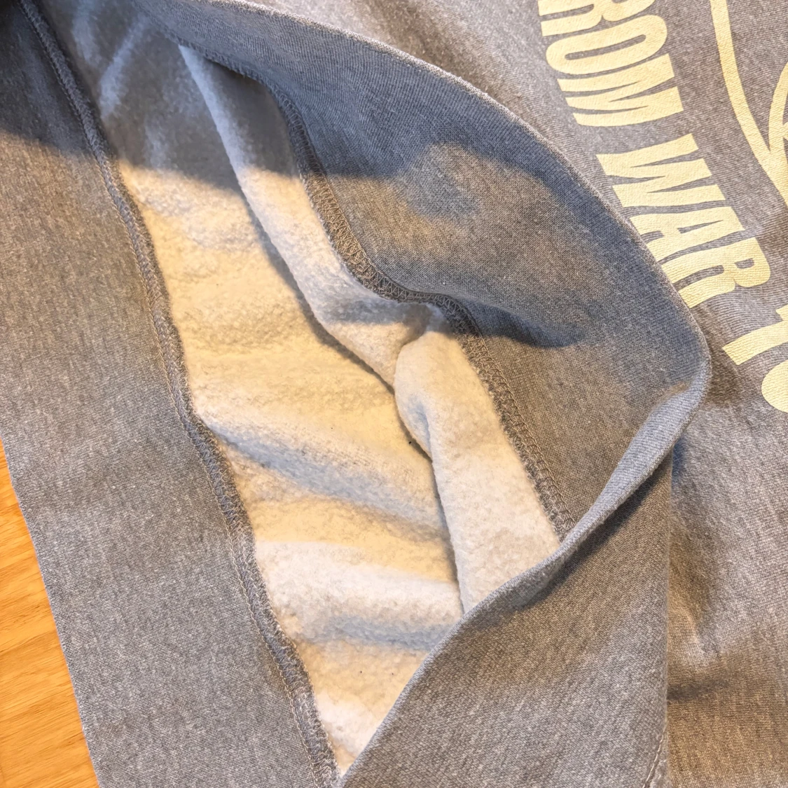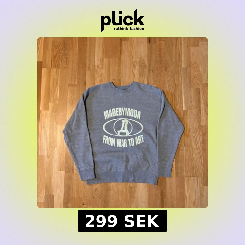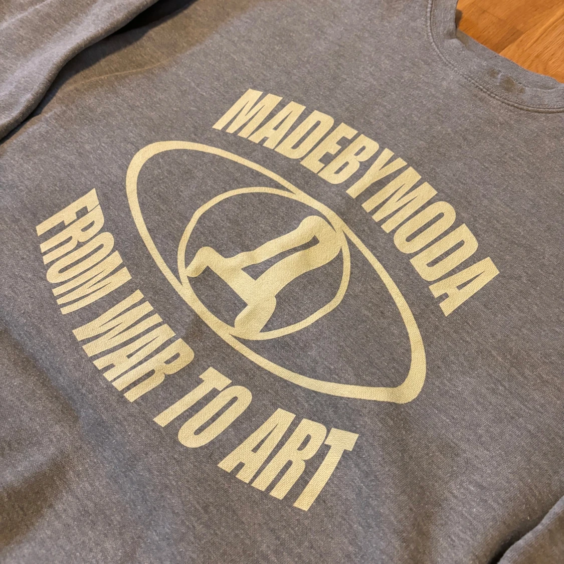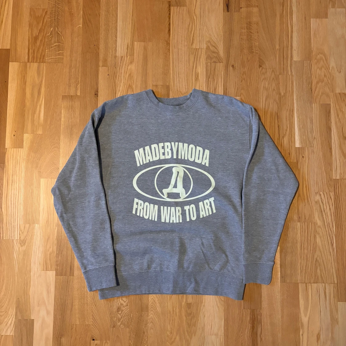 Säljer en grå sweatshirt från Madebymoda med trycket 'From War to Art' på framsidan. Tröjan har långa ärmar och en rund halsringning. Perfekt för en avslappnad stil.