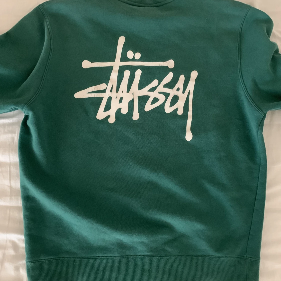 Stussy tröja med tryck på ryggen och framsidan, ej använd så mycket. obs, två små hål på framsidan men dem syns knappt vid användning