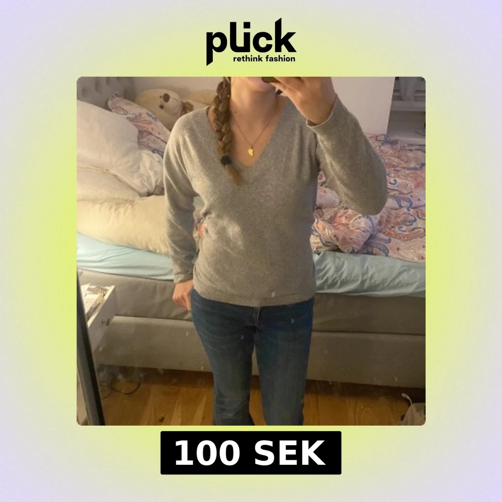 Säljer en stilren grå v-ringad tröja med långa ärmar. Perfekt för kyligare dagar och lätt att matcha med olika outfits.