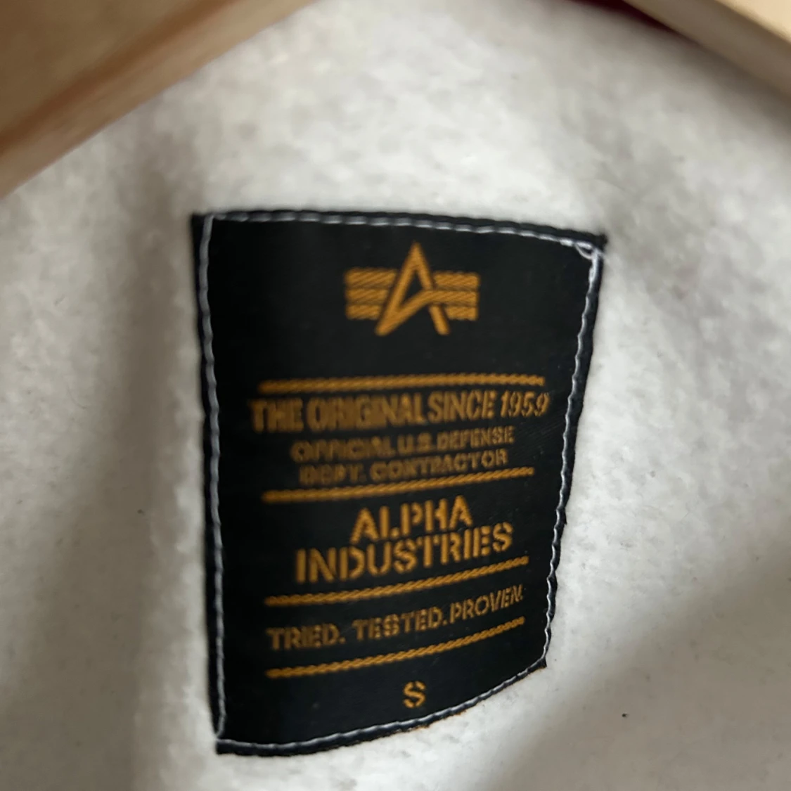 Säljer en mjuk vit sweatshirt från Alpha Industries. Inga defekter alls, tvättar strax innan ett eventuellt köp så att de lite missfärgade i nacken försvinner. Passar S