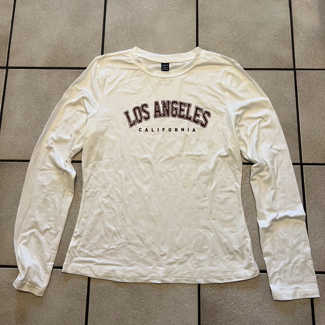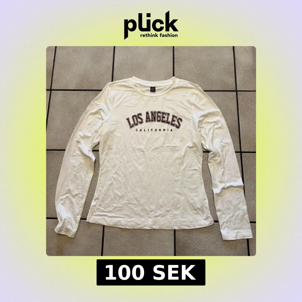 Säljer en vit långärmad tröja med texten 'Los Angeles California' tryckt på framsidan. Perfekt för en avslappnad stil. Tröjan har en rund halsringning och är gjord i ett mjukt material.
