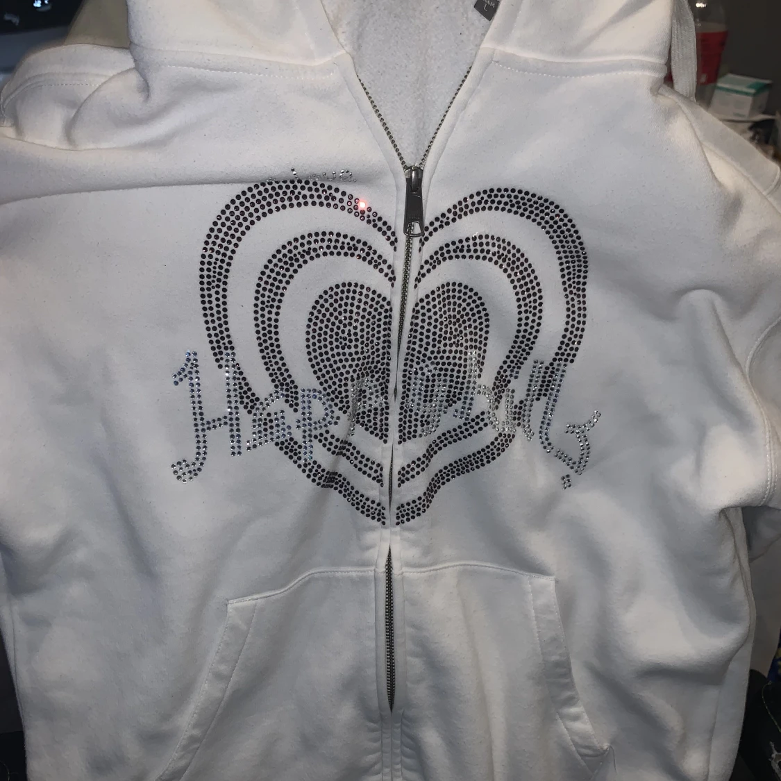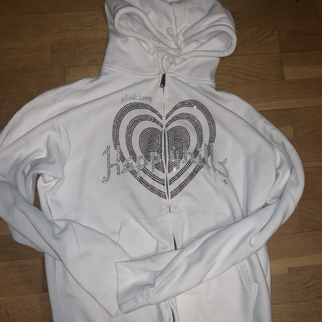 Jag säljer min vita Happyhills Rhinestone ziptröja med bordersde lila pärlor. Använts sparsamt så den är i bra skick, 9/10. Skriv privat för mer info/bilder!