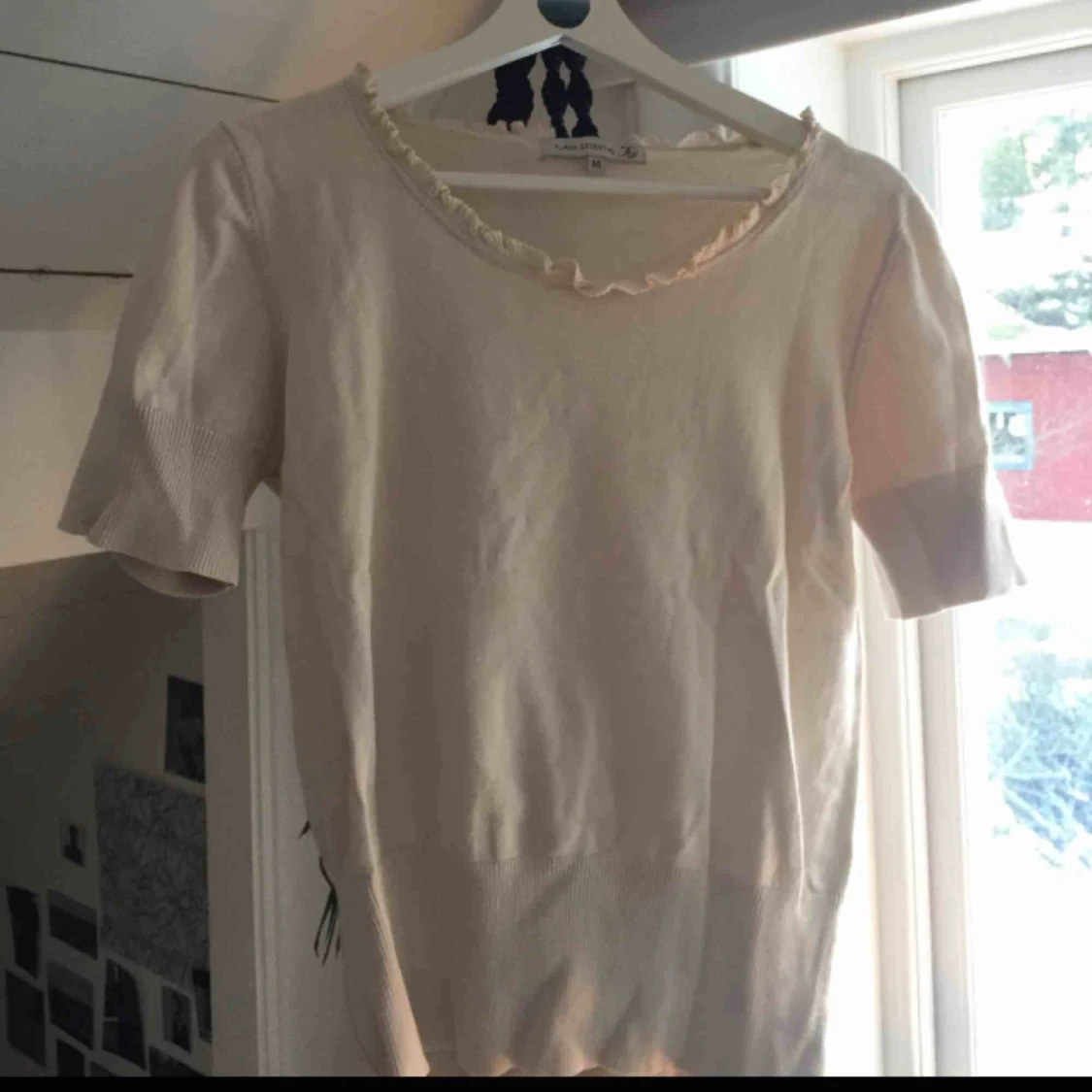 Beige blus i ganska bra skick! Har ett litet hål i armhålan som man lätt kan sy igen. Vid intresse kan även min mamma sy ihop det innan jag skickar! Volanger upptill och resår på armarna och nertill. Passar även s.