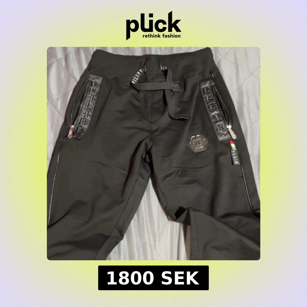 Snygga svarta byxor från Philipp Plein med dragkedjor och snörning i midjan. Byxorna har coola detaljer med märkeslogga och en modern design. Perfekta för en trendig look och dem kommer med en kofta som är jätteskön och insidan är jätte snyggt och baksidan av koftan är vacker och den har scan och är aldrig använt