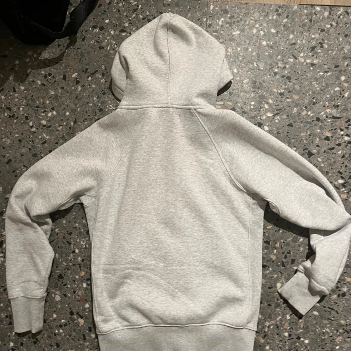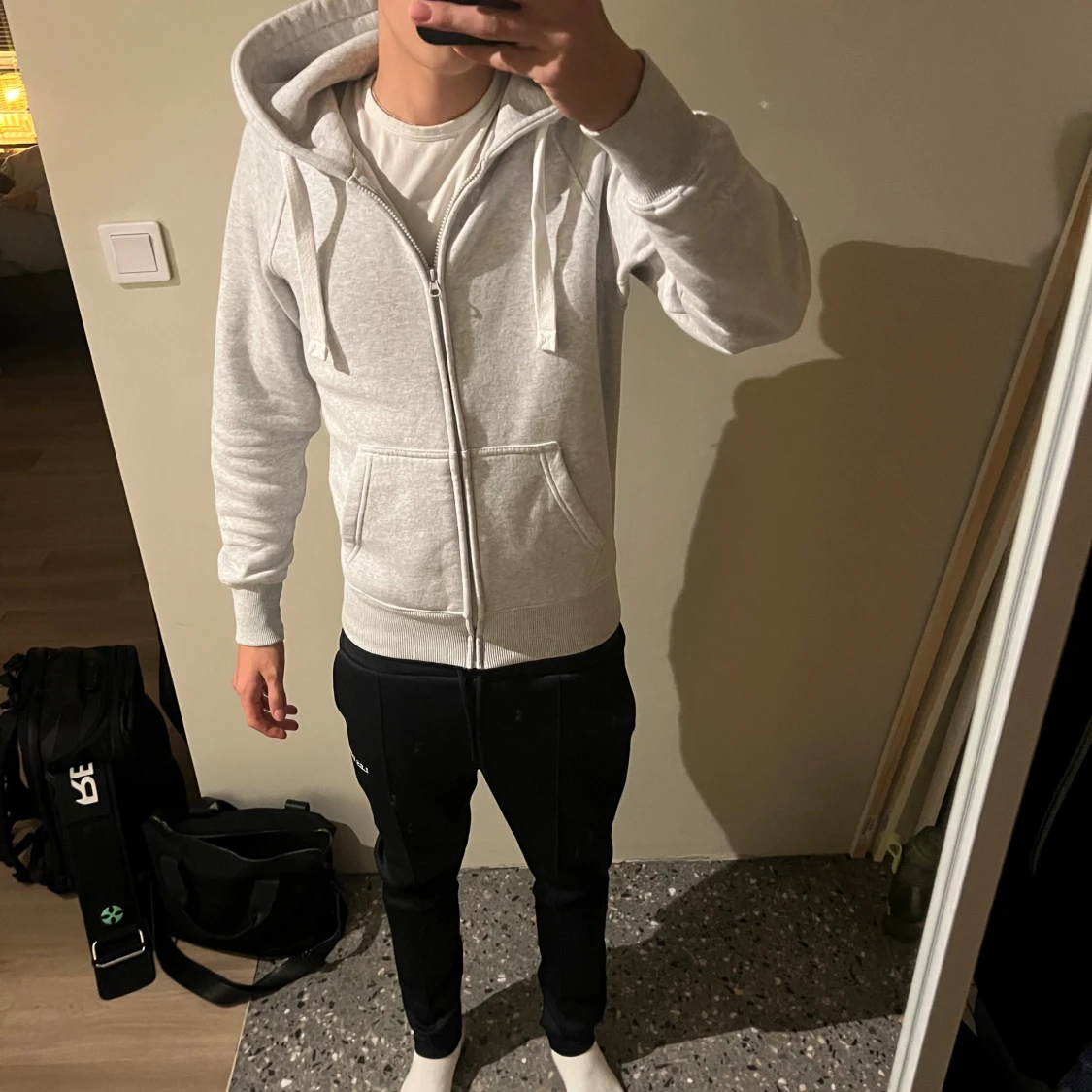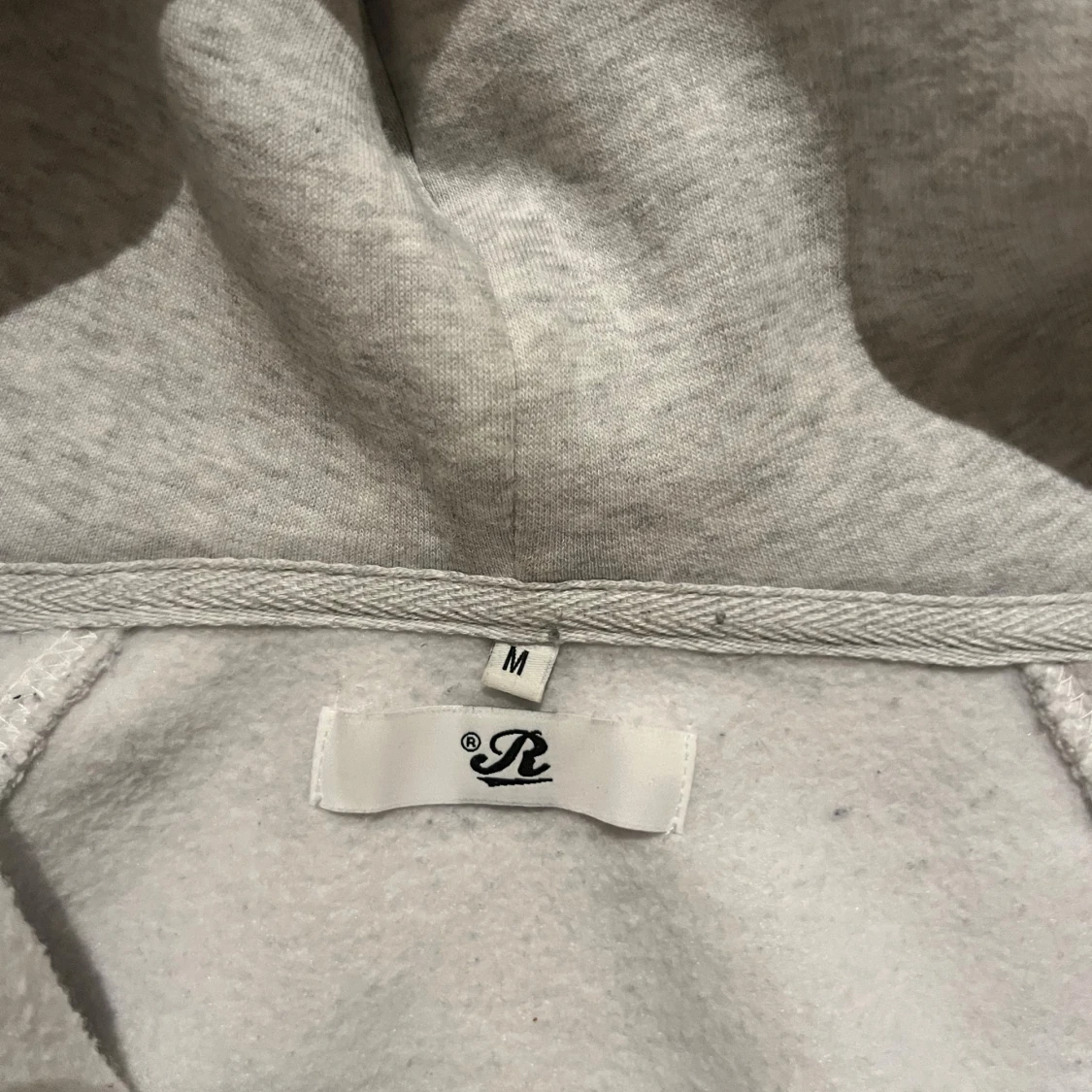 Ljusgrå hoodie från R i storlek M. Klassisk modell med huva, dragsnören och hel dragkedja framtill. Mjuk insida och två stora fickor framtill. Perfekt för chill dagar eller när du vill ha en enkel och stilren look.