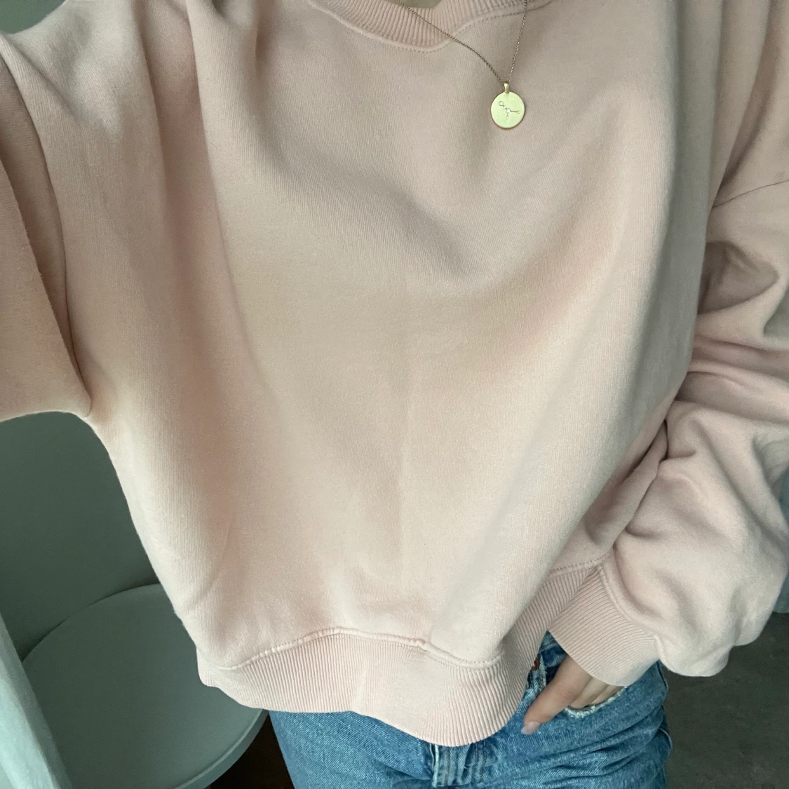 En basic ljusrosa swearshirt i strlk L men är inte oversized och sitter därför som en S/M💞 (lite mer rosa i verkligeten än vad som syns på bilderna)
