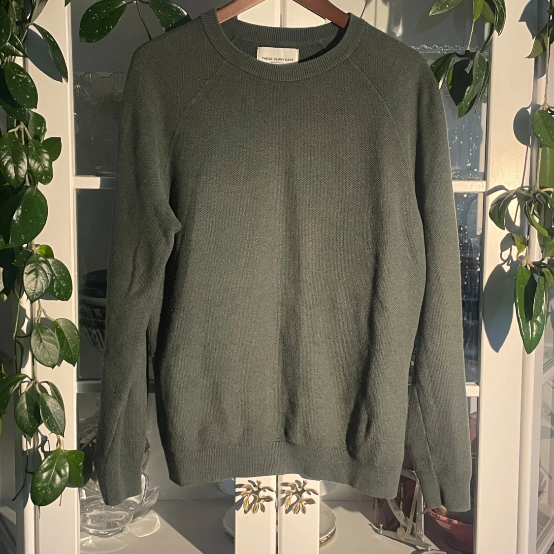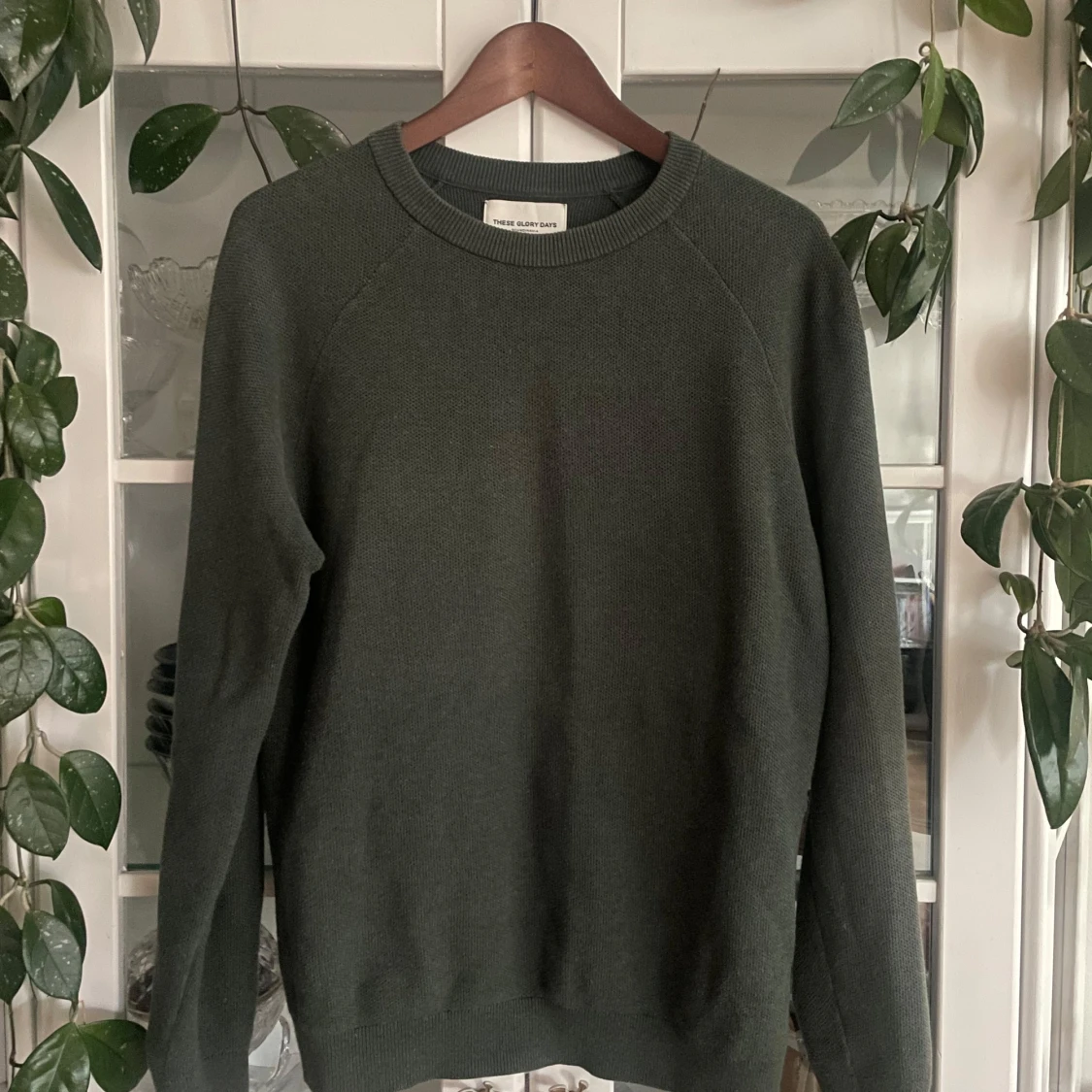 Säljer en stilren mörkgrön stickad tröja från These Glory Days. Tröjan har rund halsringning, ribbade muddar och är långärmad. Perfekt för lager-på-lager och funkar året runt. Enkel att matcha med jeans eller chinos.