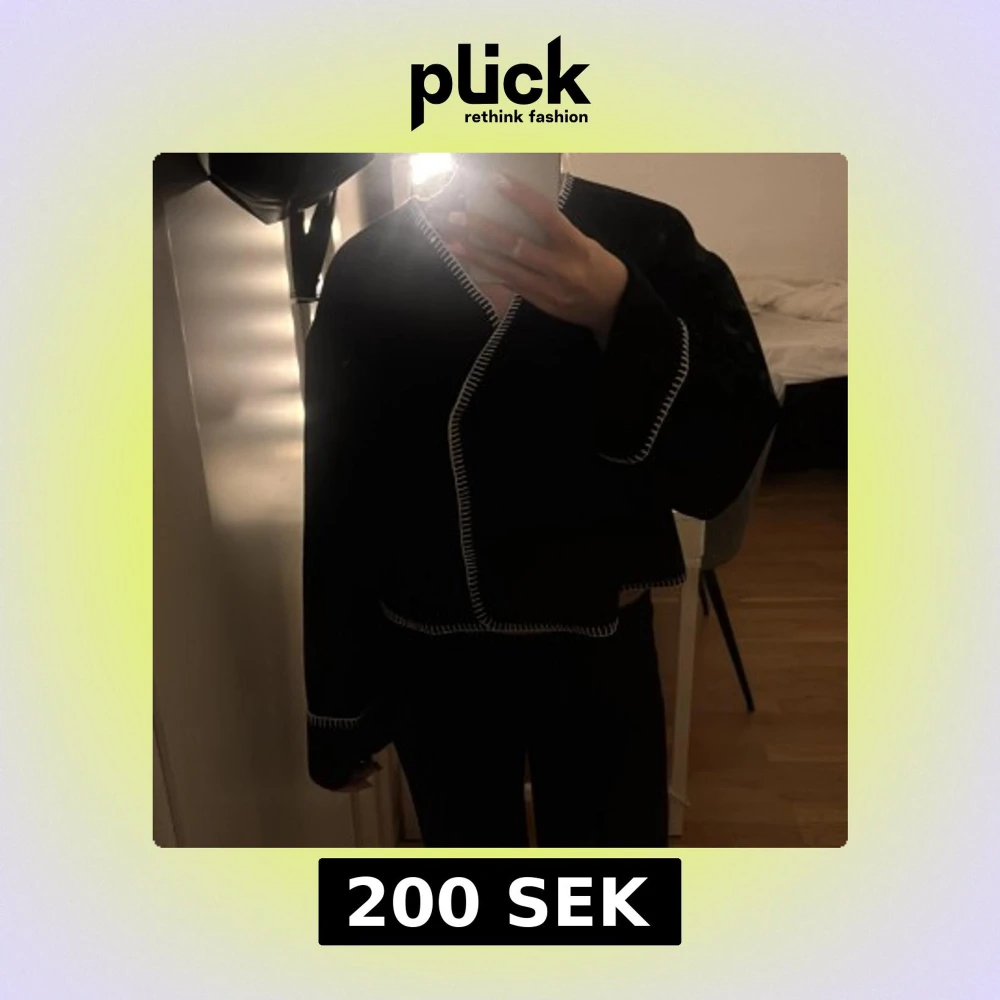 Svart tun jacka från Gina Tricot med vita dekorativa sömmar längs kanterna. Koftan har lång ärm och en loose passform, perfekt för lager-på-lager. Enkel och stilren design som ger en cool touch till din outfit.