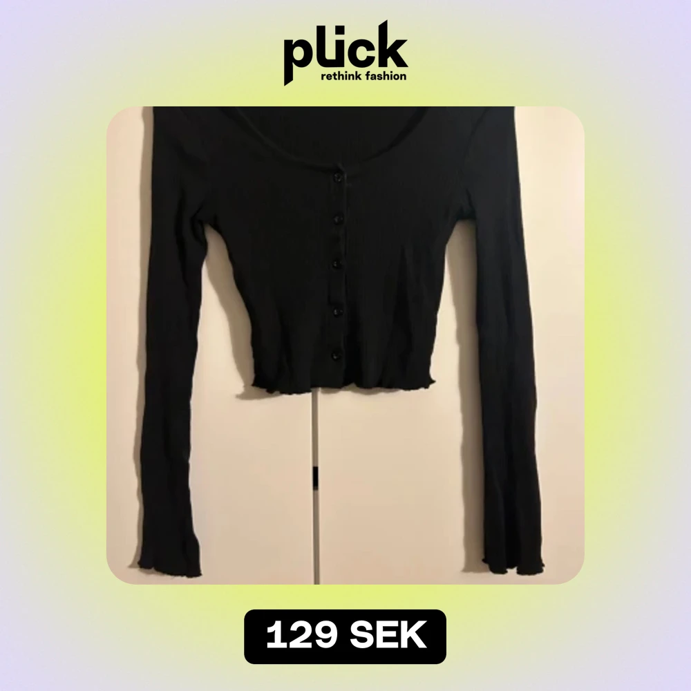 En tunn svart ribbad kardigan ifrån GinaTricot. Gullig lite vågig detalj vid ärmarna och nere vid tröjans slut. Bra skick! Storlek S men borde även funka på XS.