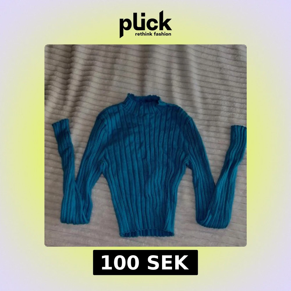 Säljer en turkos ribbad stickad tröja från FB Sister. Tröjan har lång ärm, hög hals och är figurnära i modellen. Perfekt för att addera färg till din garderob!