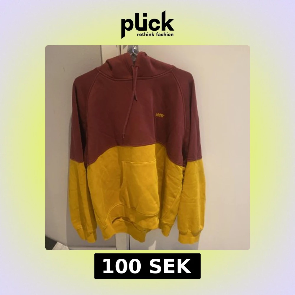 Säljer en hoodie från Levi's i vinrött och gult. Tröjan har en stor magficka, huva med dragsko och broderad Levi's-logga på bröstet. Perfekt för dig som gillar färg och vill ha en skön och avslappnad stil.