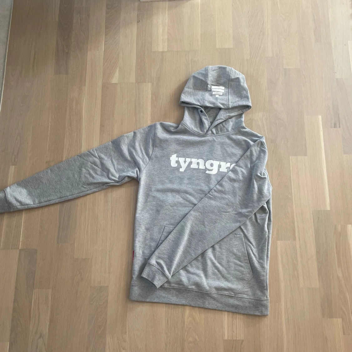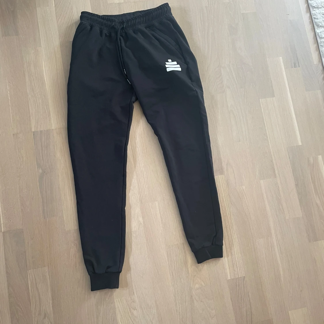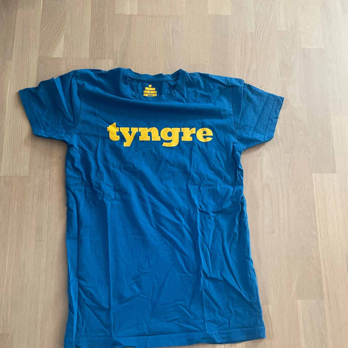 Blå tyngre t shirt med gult tryck storlek S. Grå tyngre hoodie med vitt tryck storlek S. Svart tyngre byxa med vitt tryck storlek S