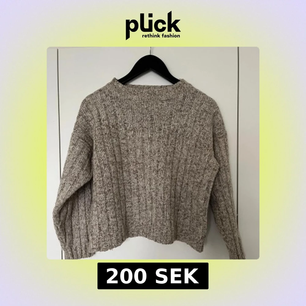 En stickad ulltröja med en ribbad textur. Tröjan har en rund halsringning och långa ärmar. Den har en kortare, boxig passform. Unisex. Funkar även till dam. Mycket fint skick. 40% akryl, 33% bomull och 27% ull. Mått: Längd ca 57 cm Ärmlängd mätt från axeln ca 43 cm Byst ca 55 cm Midja ca 52 cm