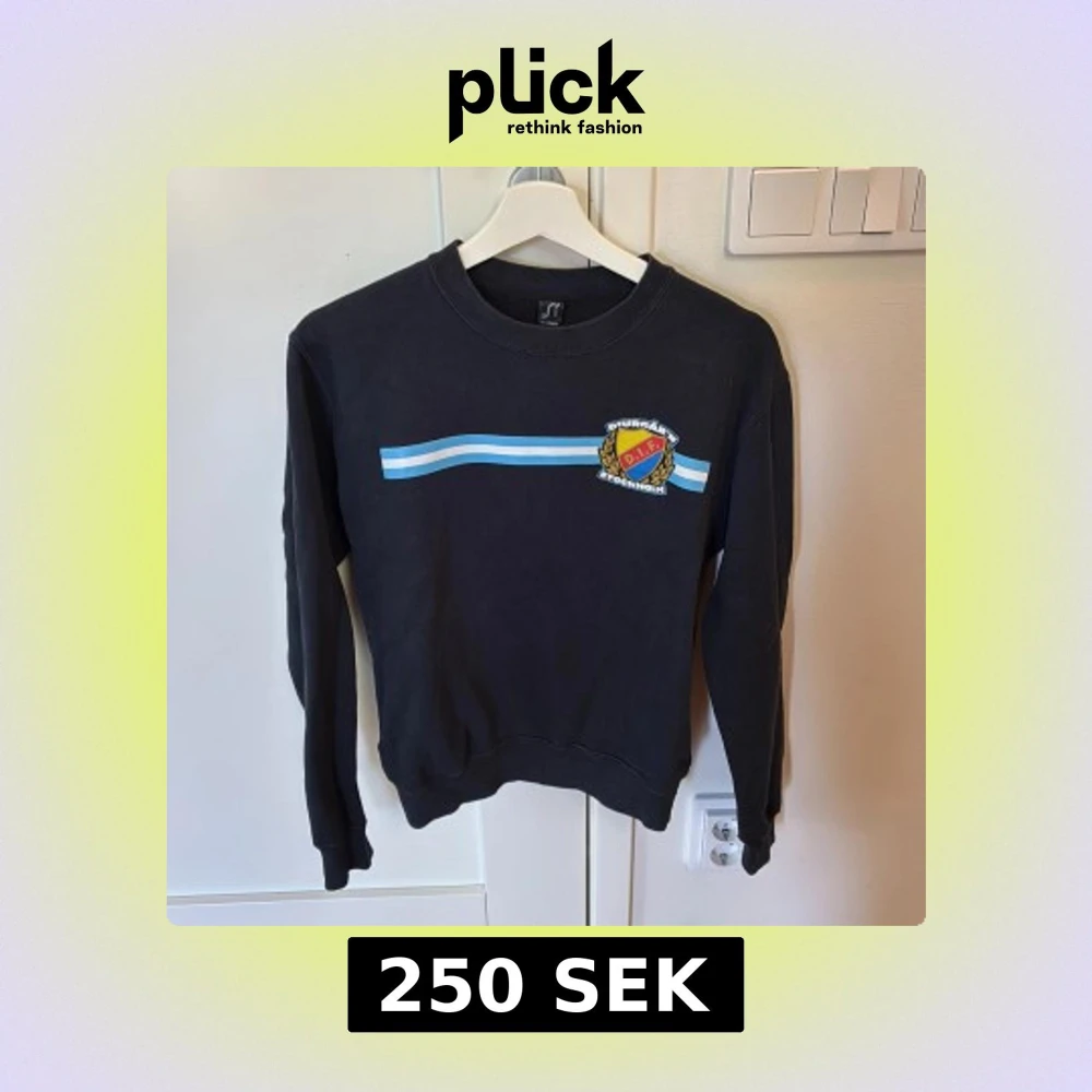 Svart sweatshirt med Djurgårdens IF Stockholm-logga på bröstet och blåvita ränder över framsidan. Rund hals och långa ärmar, tillverkad i mjuk bomull. Perfekt för dig som vill visa ditt stöd för DIF och gillar sportig stil.