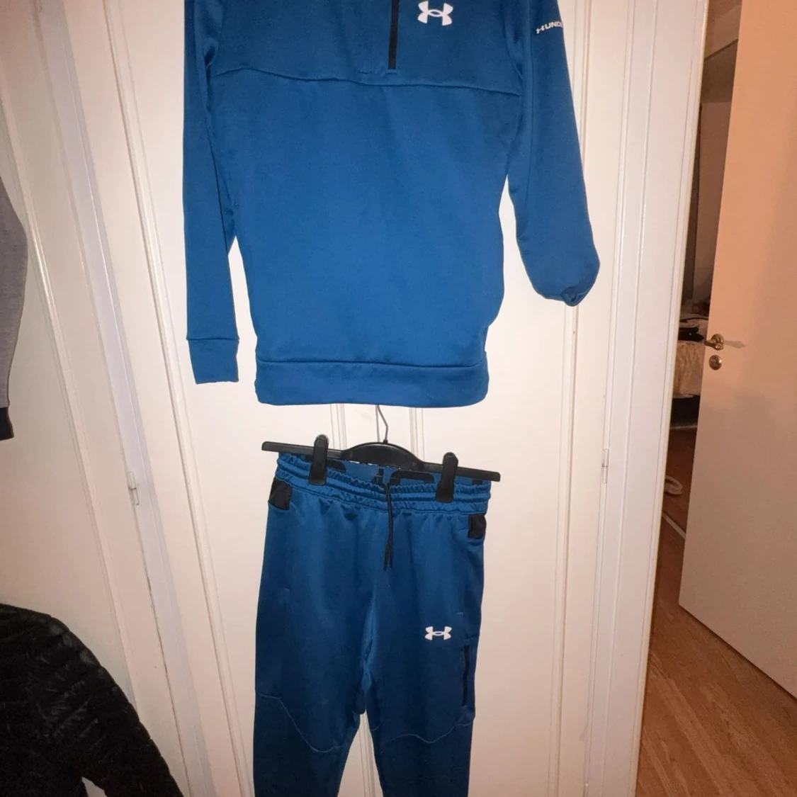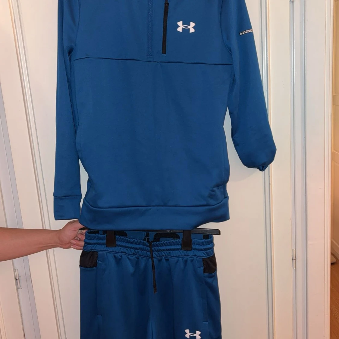 Blå hoodie från Under Armour med half zip och svart detalj vid dragkedjan. Tröjan har lång ärm, vit logga på bröstet och är gjord i ett mjukt, sportigt material som passar perfekt till träning. Snygg och enkel design med normal passform.