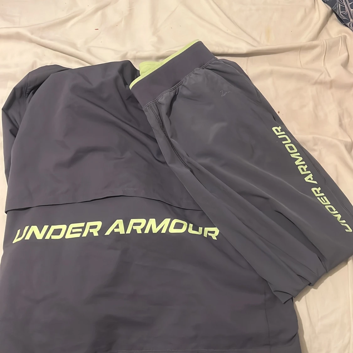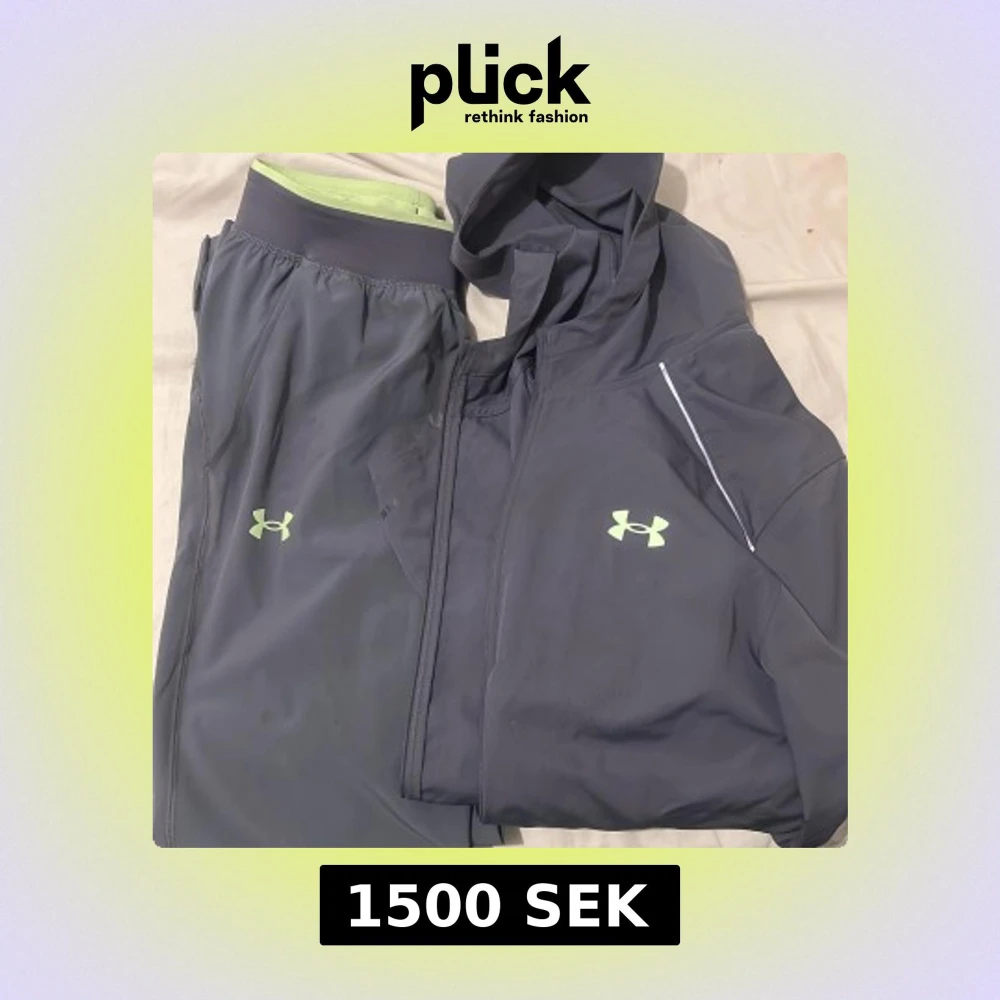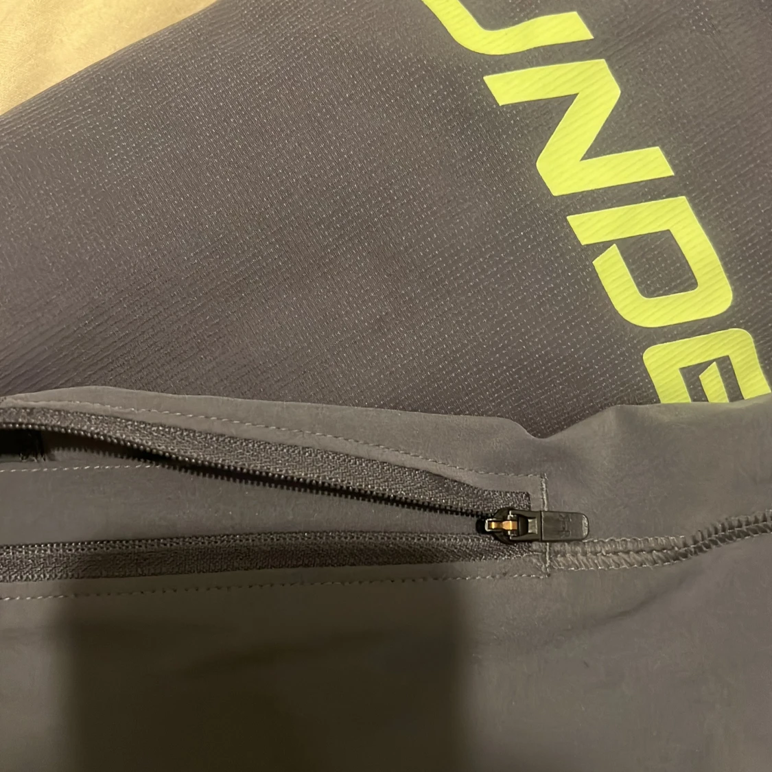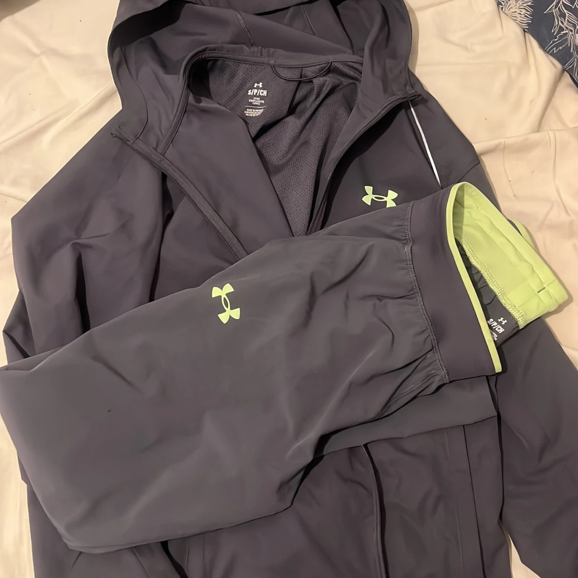 Säljer en grå hoodie från Under Armour med limegröna loggor och detaljer. Tröjan har huva, dragkedja framtill och är tillverkad i ett lätt och sportigt syntetmaterial. Perfekt för träning eller chill. Snyggt tryck på ryggen och ärmarna.