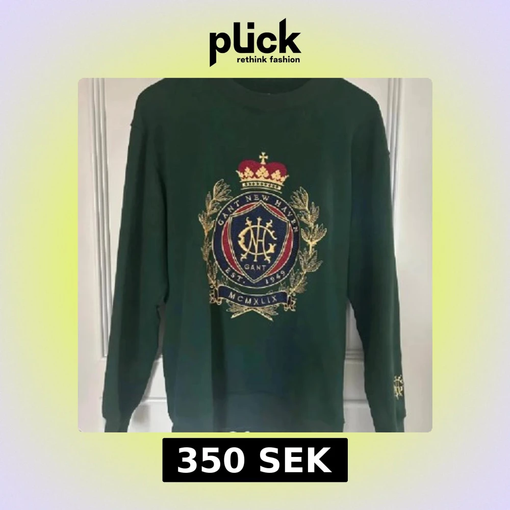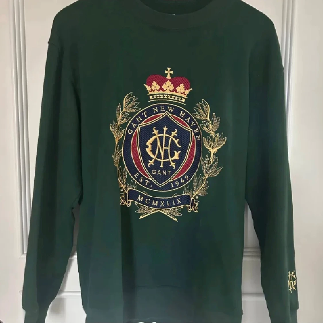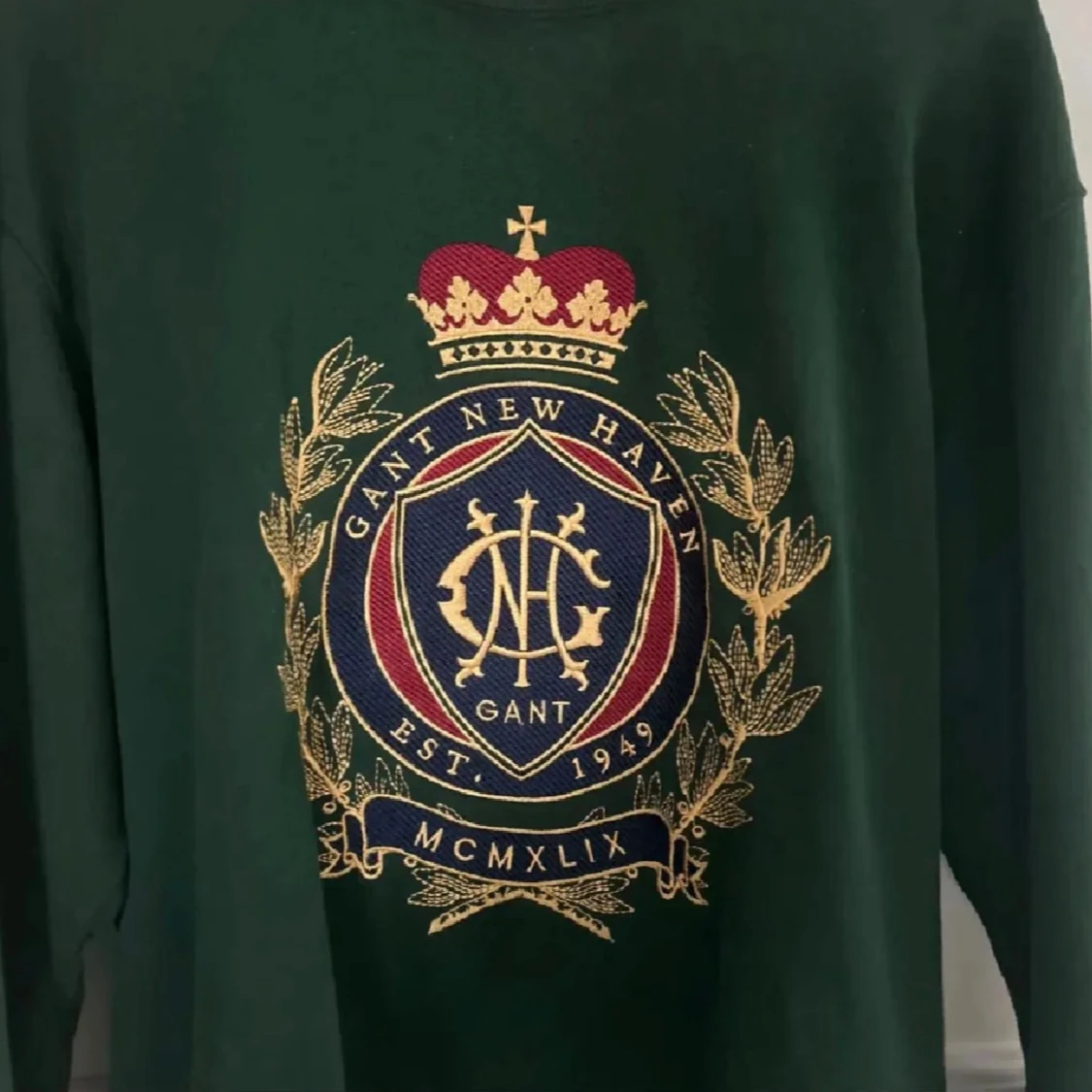 Mörkgrön sweatshirt från Gant med stort broderat emblem i guld, rött och blått på bröstet och mindre brodyr på ärmen. Tröjan har relaxed fit, rund hals och långa ärmar. Perfekt för dig som gillar preppy och klassisk stil.