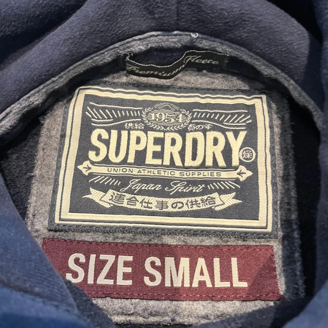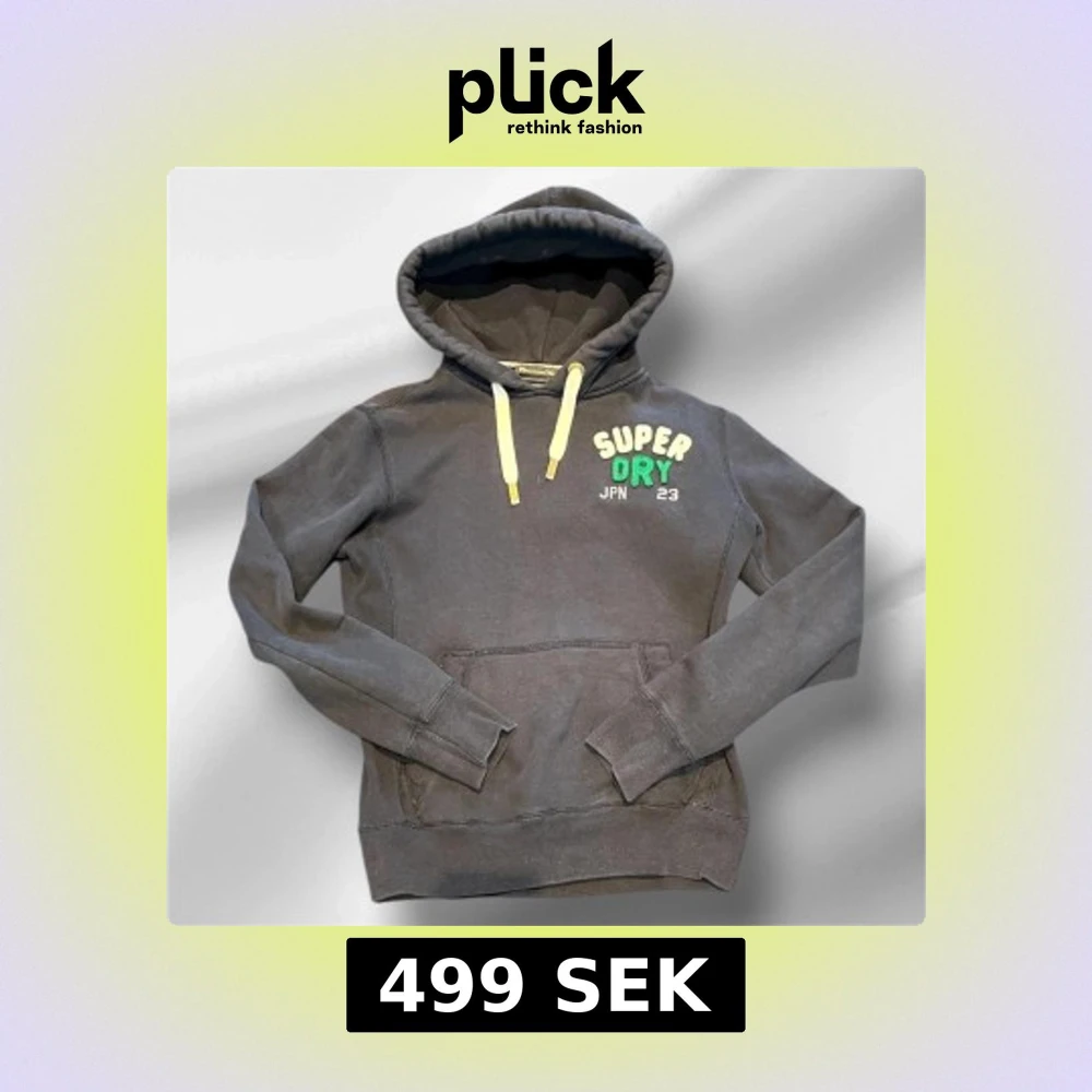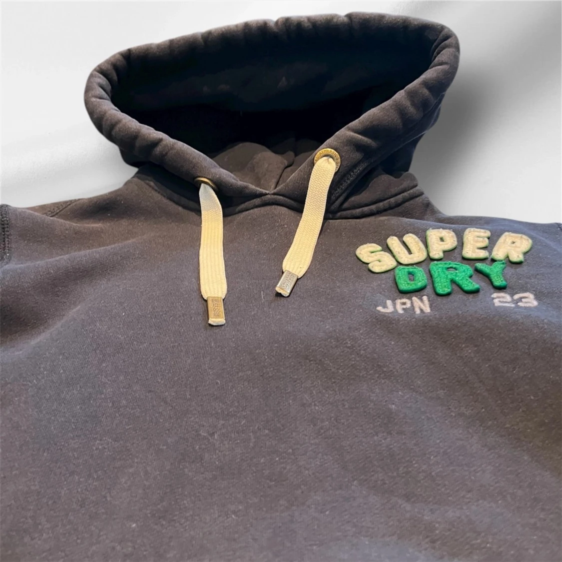 Mörkgrå hoodie från Superdry med broderad logga i vitt och grönt på bröstet. Tröjan har huva med ljusa snören och en klassisk känguruficka framtill. Mjuk insida i fleece och långa ärmar. Perfekt för chill dagar eller när du vill ha en avslappnad stil.