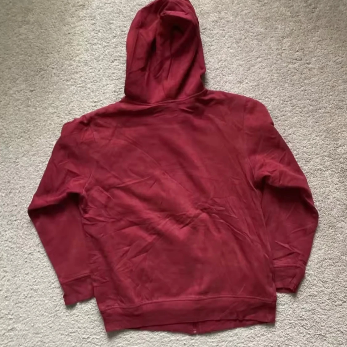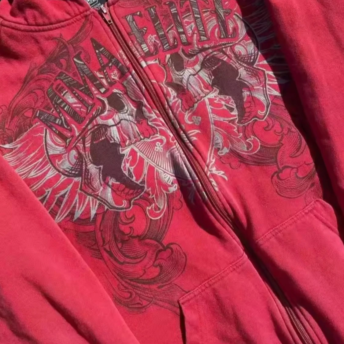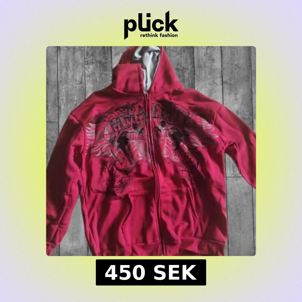 Säljer en röd vintage hoodie med stort tryck av dödskallar och vingar på framsidan. Tröjan har dragkedja, huva och två fickor framtill. Perfekt för dig som gillar streetwear och vill sticka ut med en cool design.