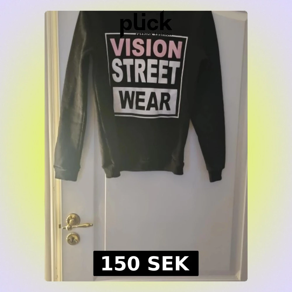 Svart sweatshirt från Elfin med stort tryck i vitt och rosa framtill där det står 'VISION STREET WEAR' rätt liten i storleken passar som S.. Tröjan har rund hals, långa ärmar och ribbade muddar. Perfekt för en streetstyle-look.