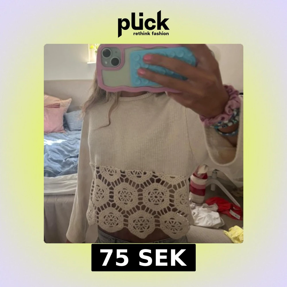Superfin beige långärmad tröja från Zara med ribbad struktur och bred virkad spets nertill. Tröjan är croppad och har rund halsringning. Perfekt för dig som gillar unika detaljer och en chill men ändå söt stil. Den är så unik. Perfekt till hösten, den gör en basic outfit till cool!