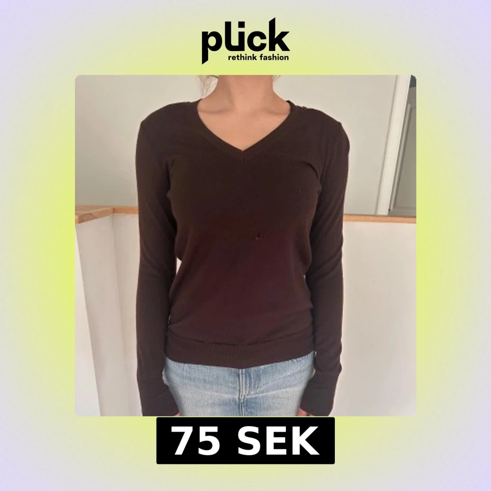 En enkel och stilren mörkbrun tröja med v-ringning och långa ärmar. Har en ganska tydlig slitning på magen, kan skicka bild vid efterfrågan, men är jätteskön och fin ändå