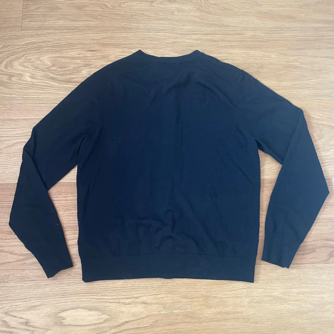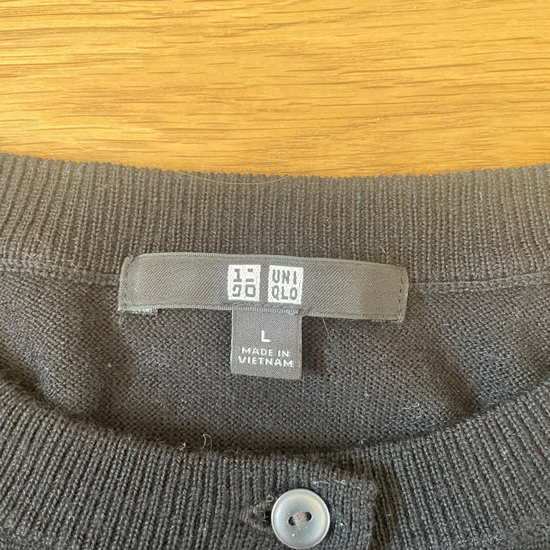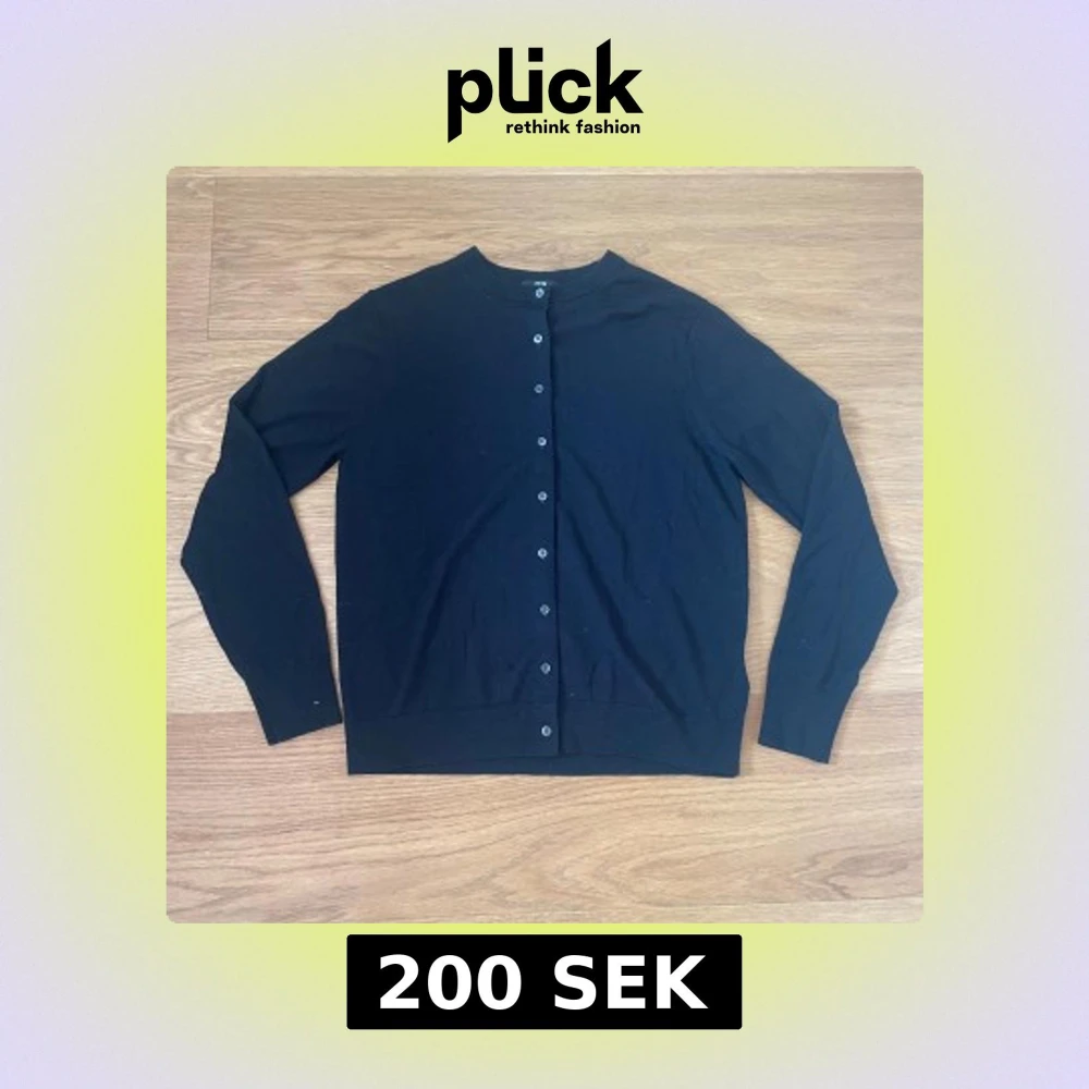 En klassisk svart kofta från Uniqlo i storlek L. Koftan har rund halsringning, långa ärmar och knäppning med svarta knappar framtill. Tillverkad i mjukt material som känns skönt mot huden. Perfekt att slänga över en t-shirt eller skjorta.
