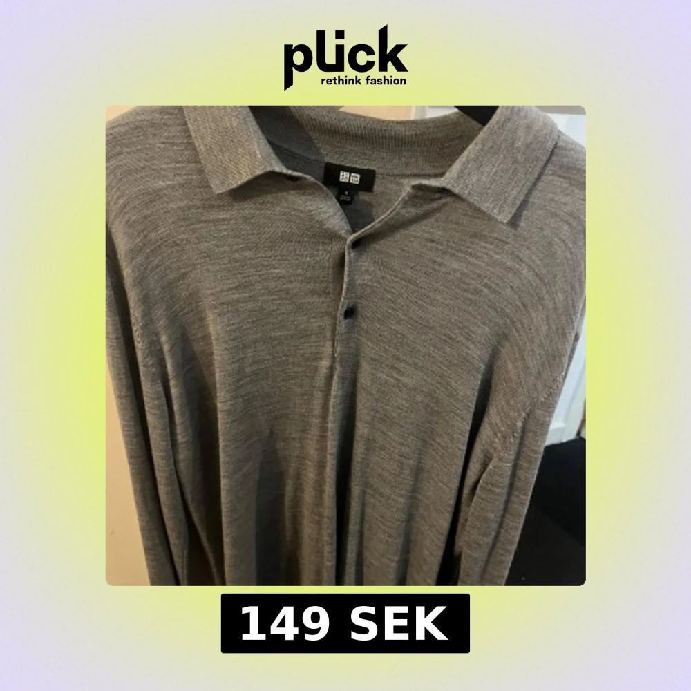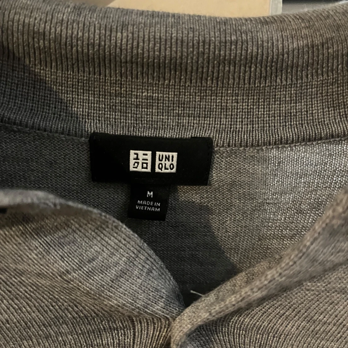 Säljer en stilren grå pikétröja från Uniqlo i mjuk merinoull. Tröjan har klassisk krage, knäppning framtill och lång ärm. Perfekt för dig som gillar en clean och enkel look med premiumkänsla.