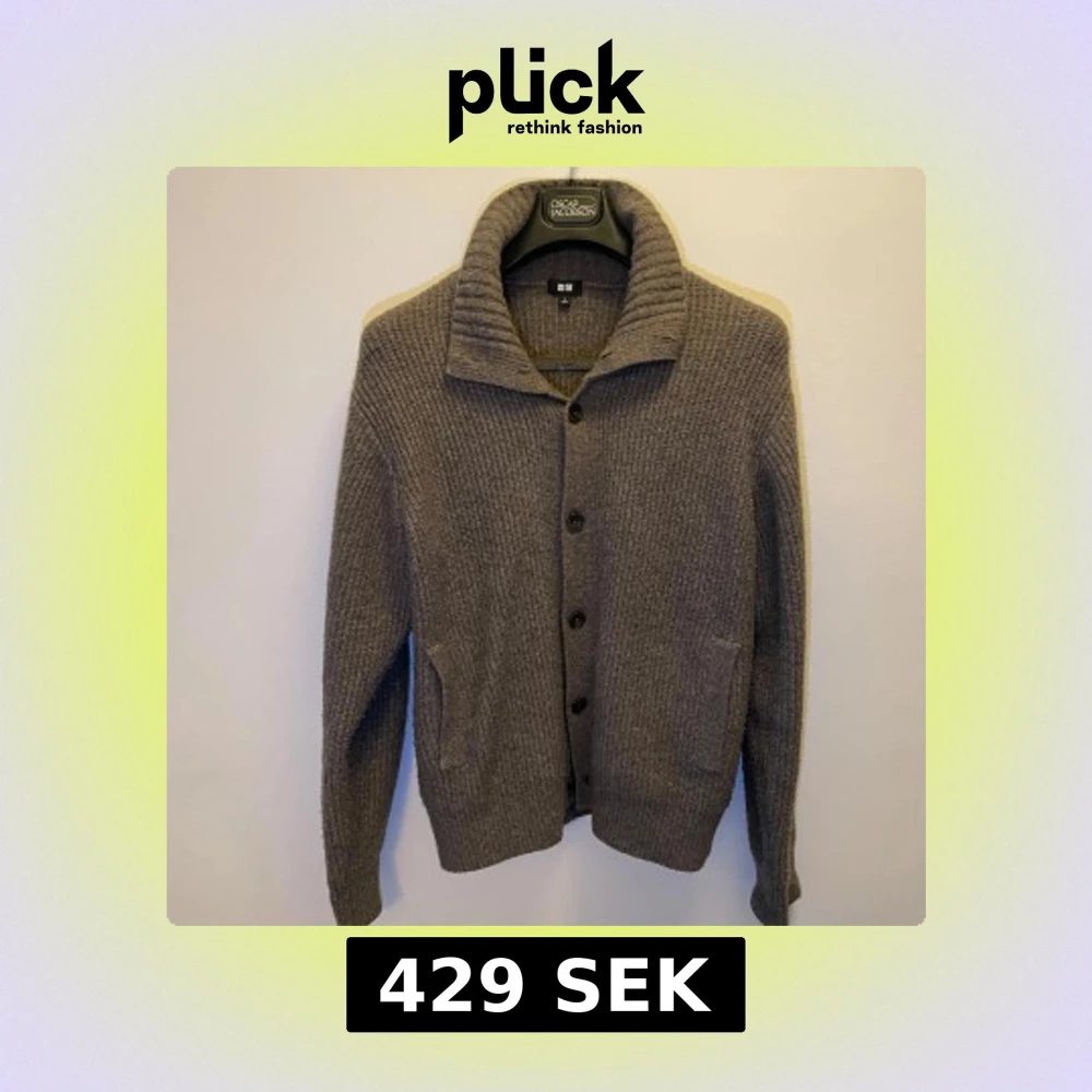 Säljer en stilren cardigan från Uniqlo med ribbad design och knappar framtill. Koftan har en hög krage och långa ärmar, perfekt för kyligare dagar. Den har också praktiska fickor på sidorna.