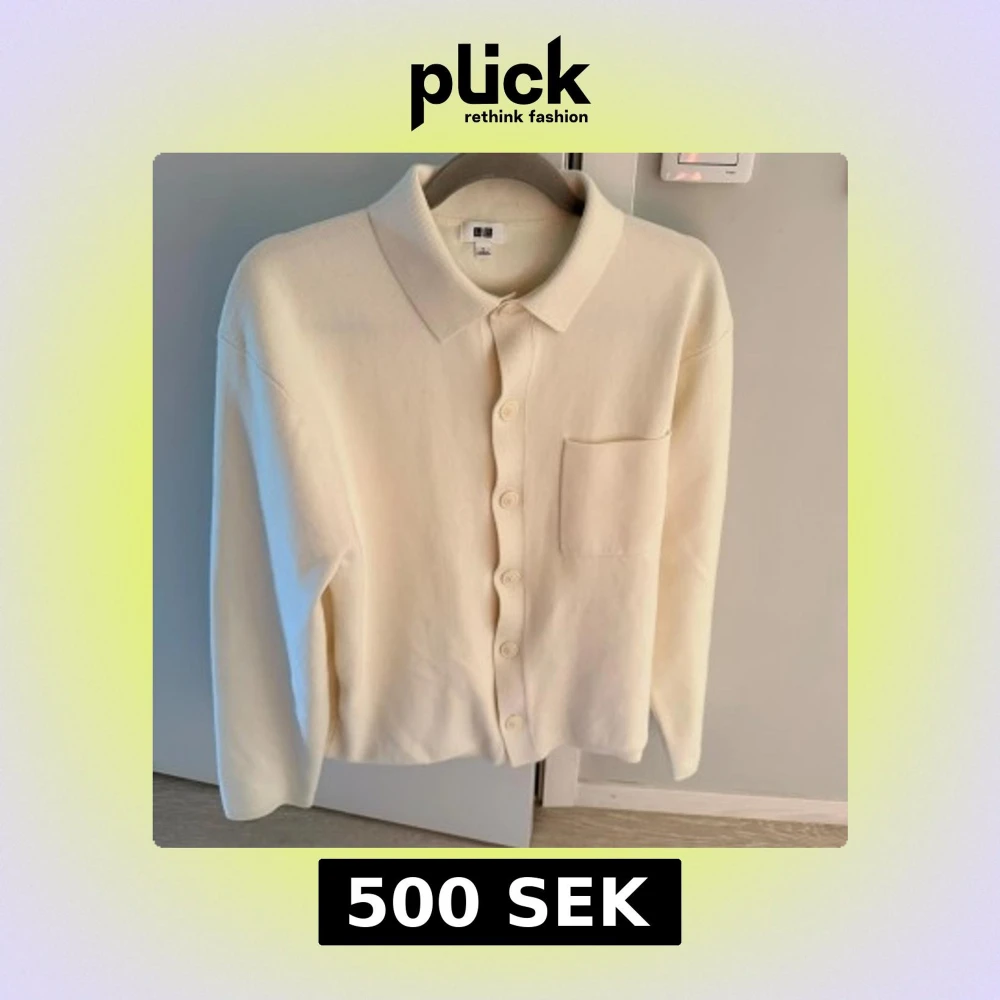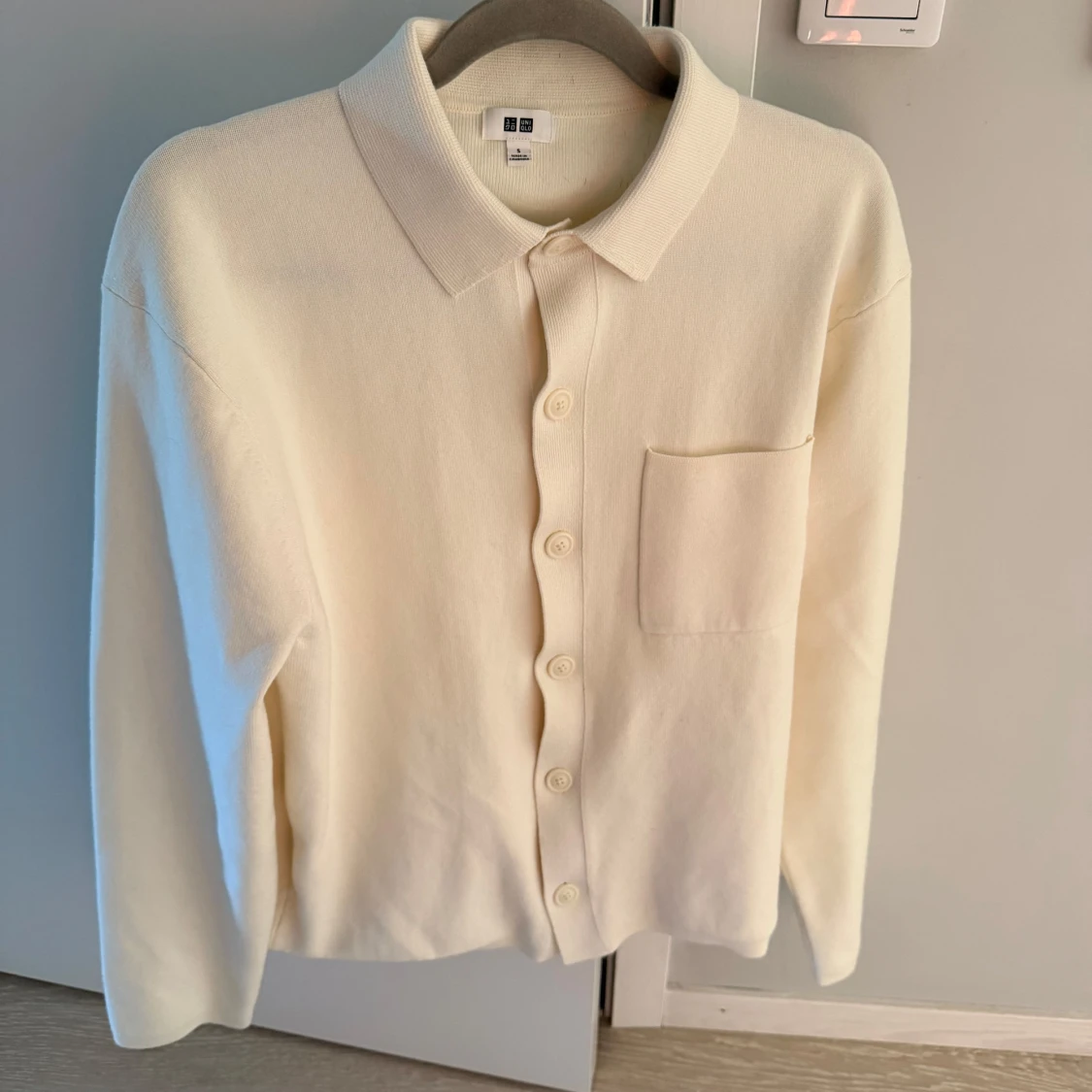 Stilren beige kofta från Uniqlo med klassisk krage, knäppning framtill och en bröstficka. Långärmad och i mjukt material som passar perfekt till lager-på-lager. Enkel och clean design som funkar till många outfits.
