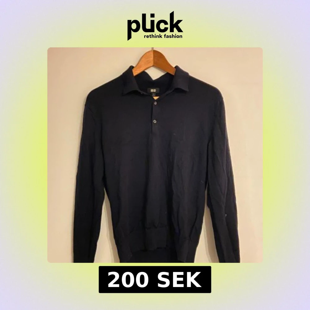 Klassisk svart pikétröja från Uniqlo i storlek S. Tröjan har lång ärm, krage och två knappar framtill. Materialet är mjukt och känns som bomull, perfekt för dig som gillar stilrena och enkla plagg. Passformen är normal och tröjan funkar året runt.