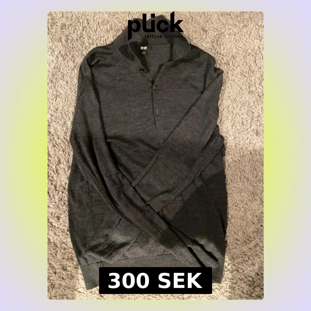 Snygg mörkgrå stickad polotröja från Uniqlo i storlek S. Tröjan har en hög krage, knappar framtill och långa ärmar. Perfekt för dig som gillar stilrena och enkla plagg med en chill vibe. Materialet är mjukt och känns skönt mot huden. Fräsch, utan defekter.