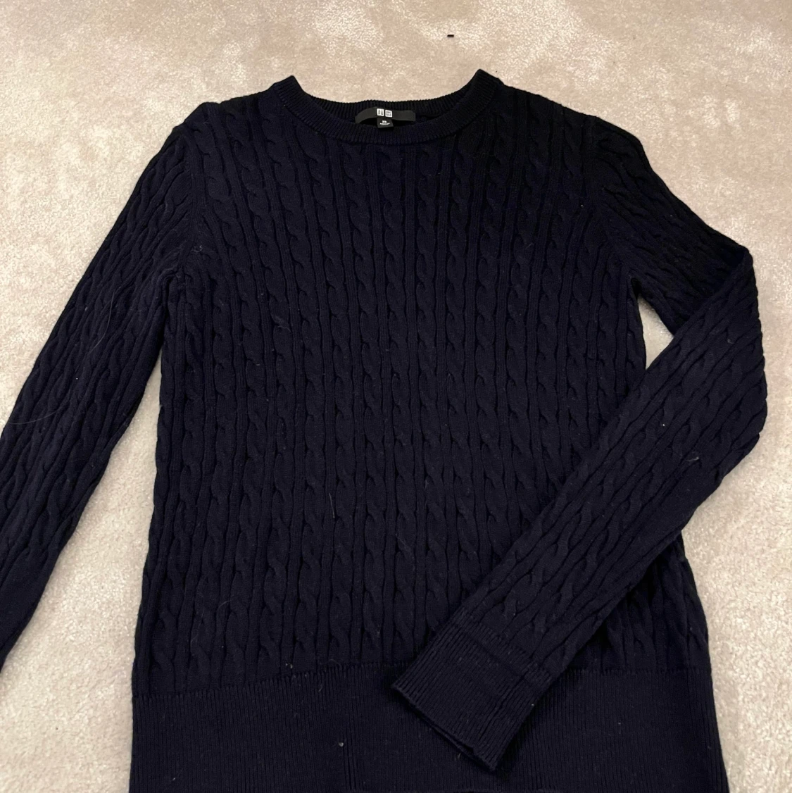 Marinblå kabelstickad tröja från uniqlo i bra skick, endast använd 3 gånger🤩 köparen står för frakt