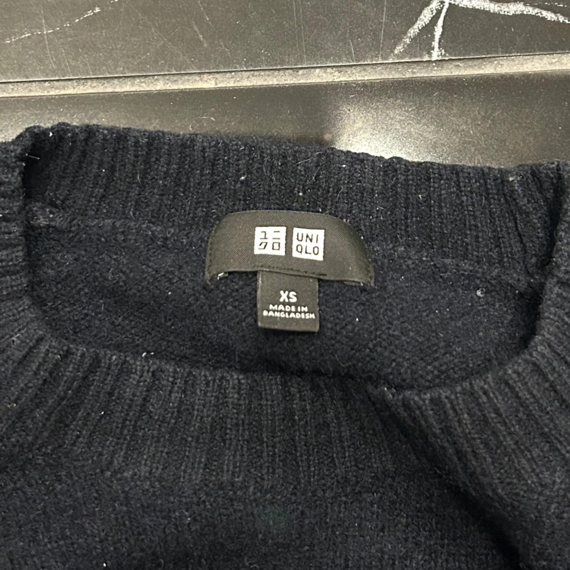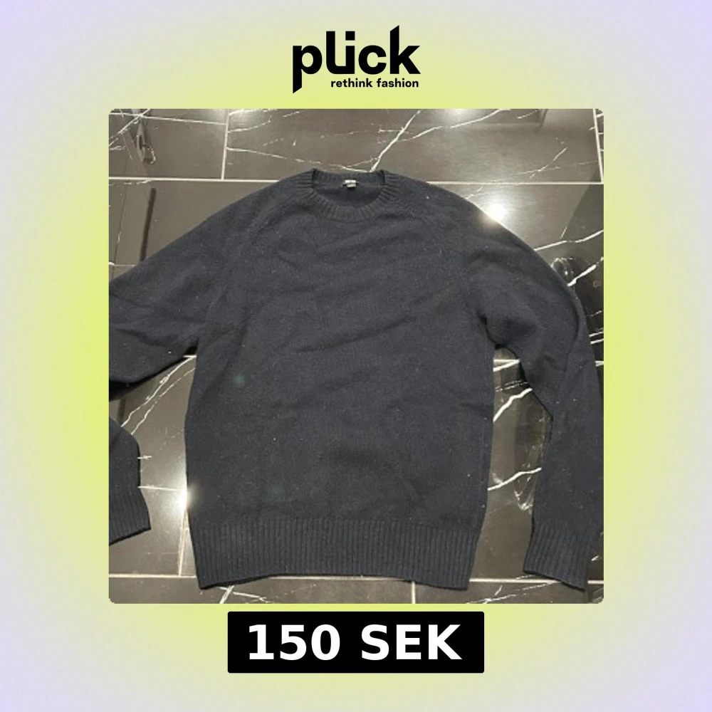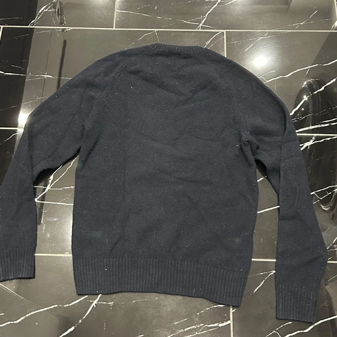 En enkel och stilren mörkblå stickad tröja från Uniqlo. Tröjan har rund halsringning, ribbade muddar och är långärmad. Perfekt för lager-på-lager och passar till det mesta. Materialet är ull som är mjukt och skönt, vilket gör den riktigt bekväm. Inga defekter