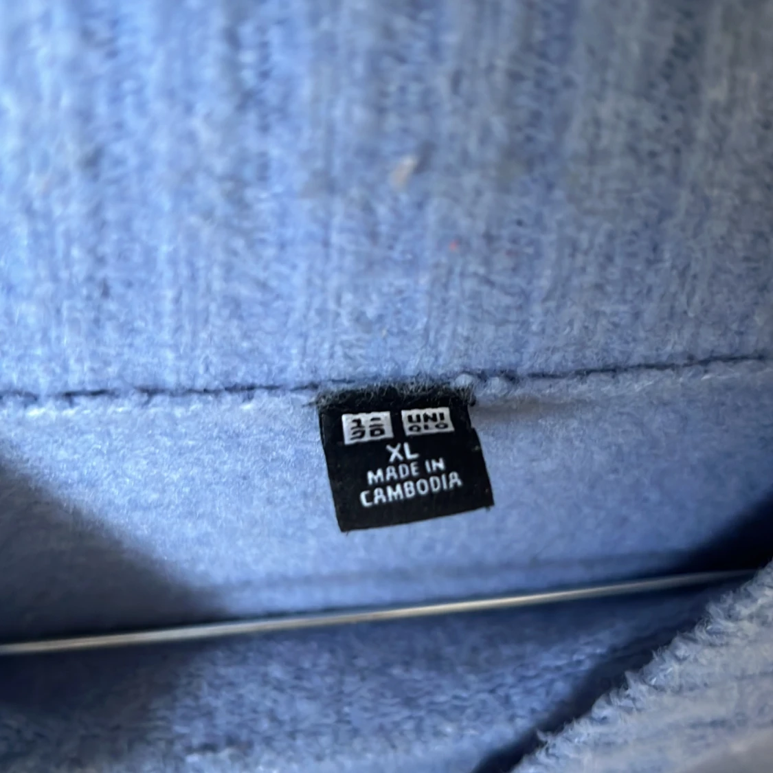 Mysig blå stickad tröja från Uniqlo i storlek XL. Tröjan har en relaxed fit med ribbade muddar och hög hals. Perfekt för lager-på-lager och chill dagar. Enkel att matcha med jeans eller kjol för en avslappnad look.