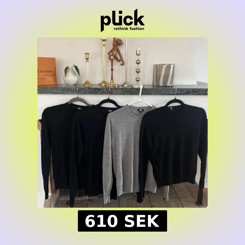 Säljer fyra stilrena långärmade tröjor från Uniqlo i färgerna svart, mörkblå och grå. Tröjorna har en klassisk passform och är perfekta för lager-på-lager. Materialet känns mjukt och bekvämt mot huden. Ena mörkblåa och den svarta har defekter jag säljer alla tröjor för 610,tröjorna går för ungefär 500 styck nya tröjorna är i storlek xs,xs,xs,s, pris går att diskutera så lägg prisförslag tveka inte jag kan sänka ganska mycket