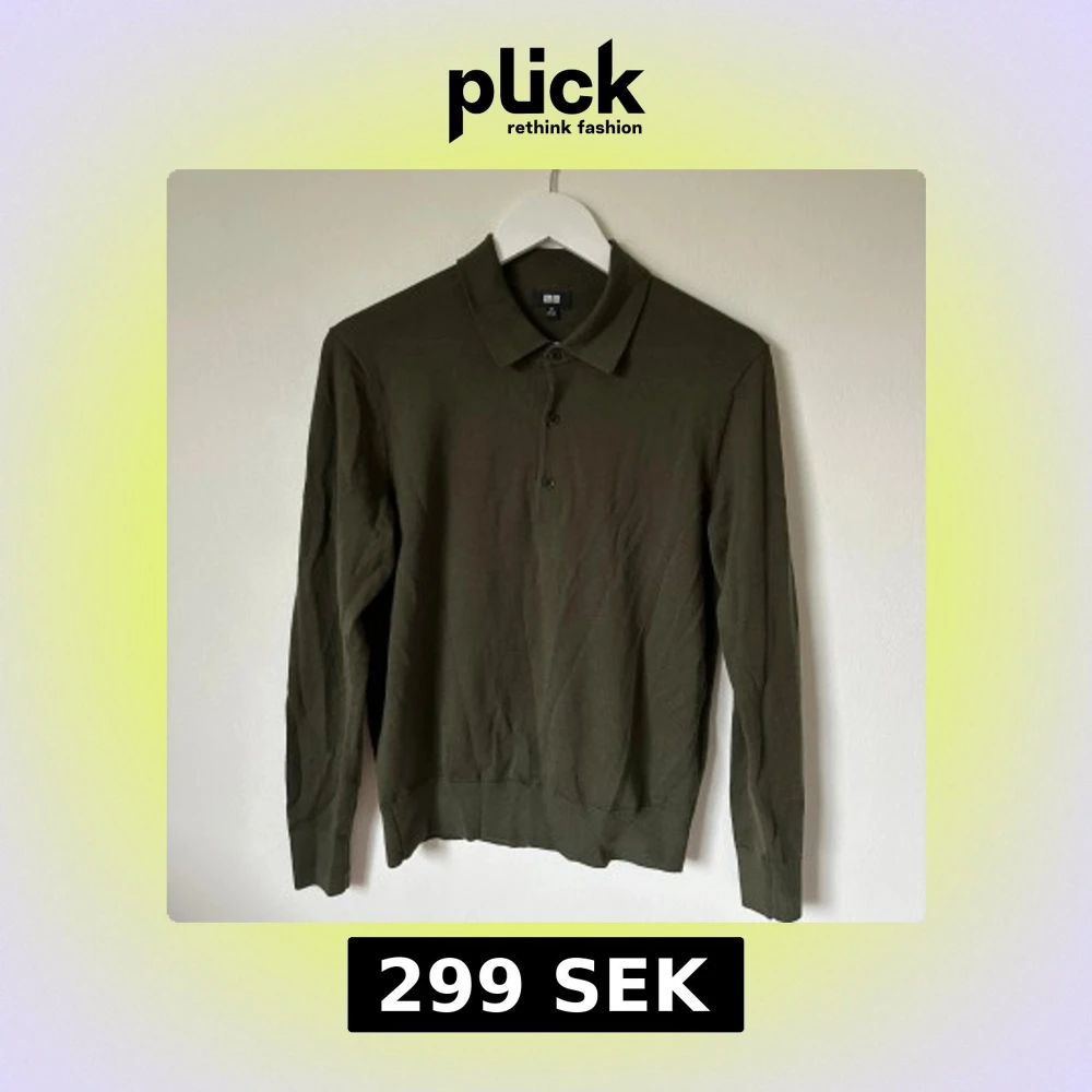 Snygg olivgrön tröja med krage från Uniqlo i storlek XS. Tröjan är tillverkad i 100% ull och har en klassisk krage med tre knappar framtill. Långärmad och med ribbade muddar vid ärmslut och nederkant. Perfekt för dig som gillar stilrena och enkla plagg. 4Ä18
