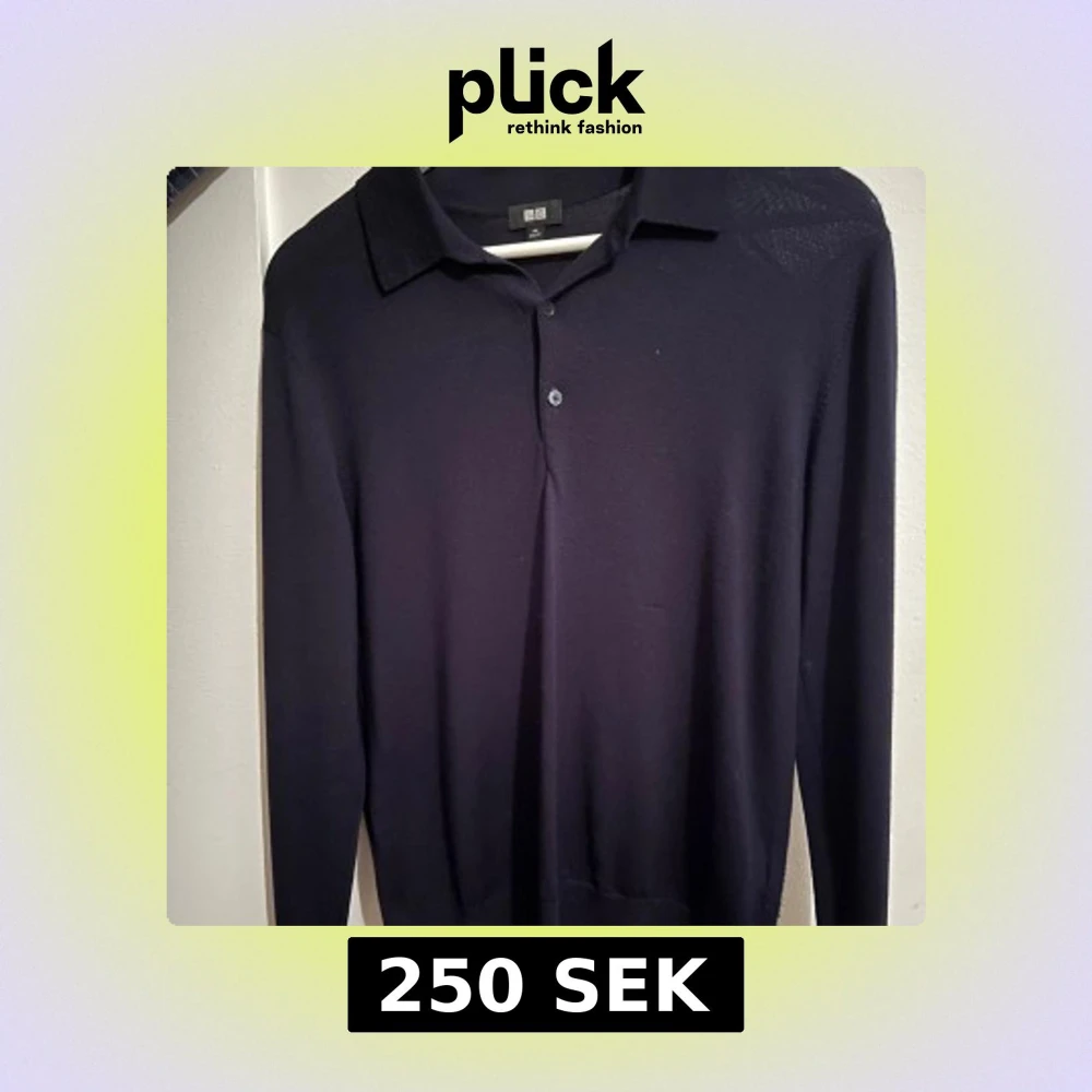 Säljer en stilren svart långärmad pikétröja från Uniqlo. Tröjan har klassisk krage och knäppning framtill med två knappar. Perfekt för en clean och enkel look.