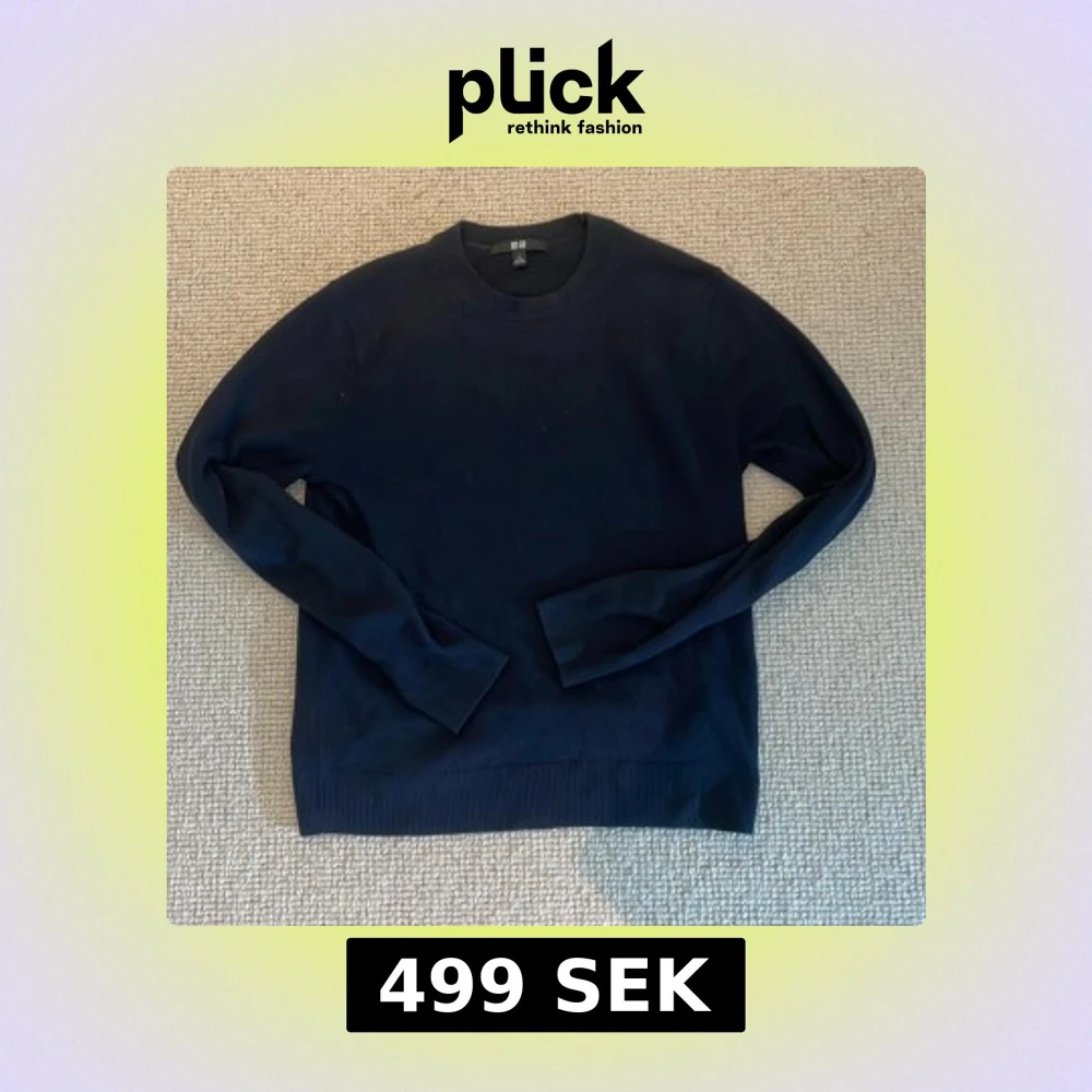 Mörkblå tröja från Uniqlo i 100% Kashmir. Tröjan har rund halsringning och långa ärmar med ribbade muddar vid ärmslut och nederkant. Den är S men krympt i tvätt.