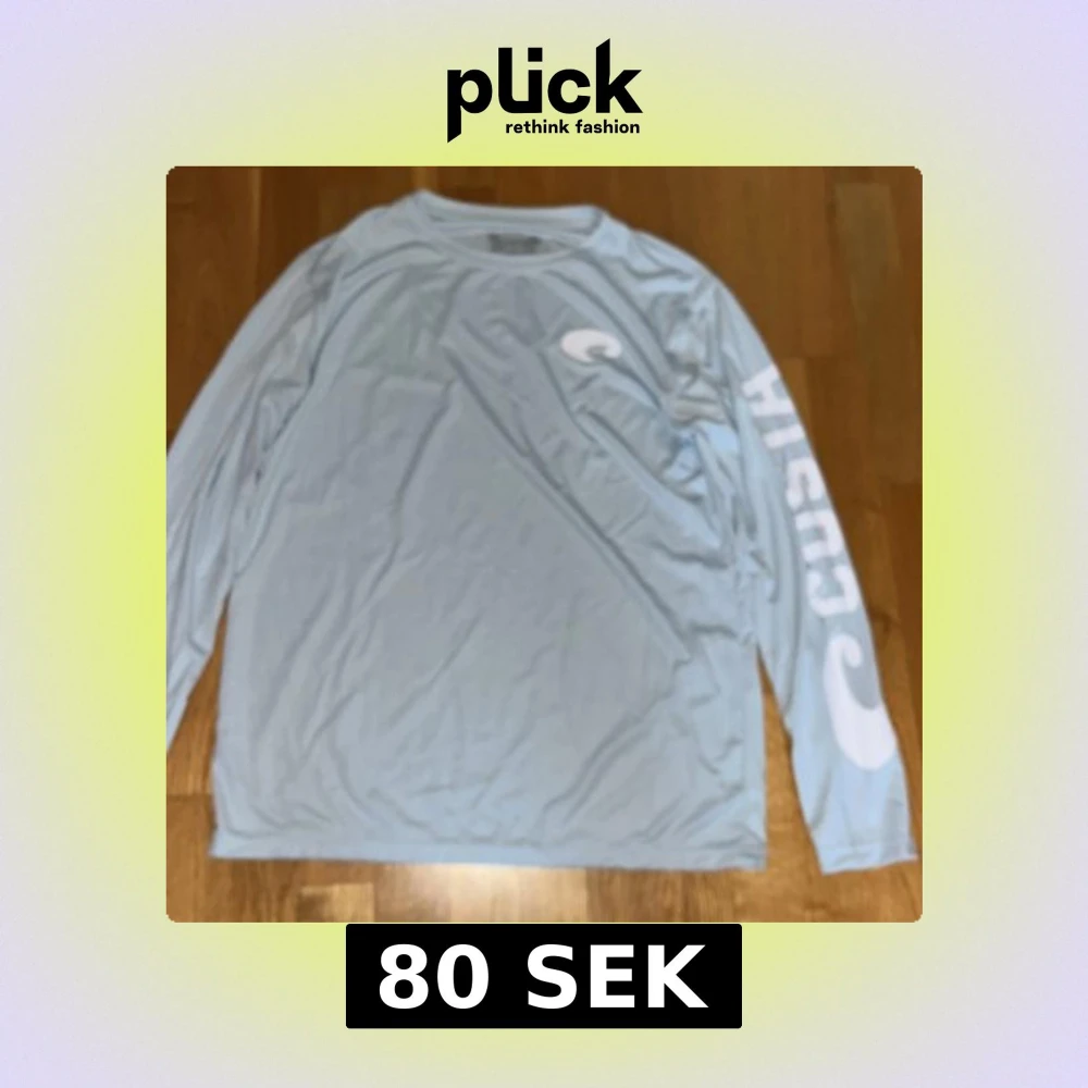 Säljer en ljusblå långärmad tröja från Costa med vit logga på bröstet och stort tryck på ena ärmen. Tröjan har rund halsringning och är tillverkad i ett tunt, syntetiskt material som passar perfekt för aktiva dagar.