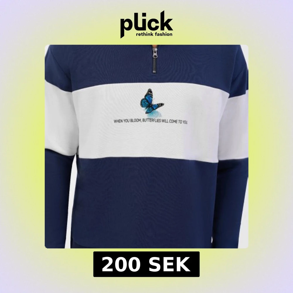 Snygg kontrastdesign i blått och vitt. Broderad text och fjäril på bröstet. Bekväm och varm, perfekt för hösten. Inga defekter eller fläckar