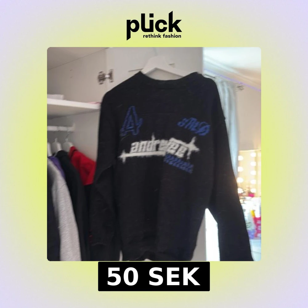 Svart stickad tröja med coola blå och vita detaljer samt tryck på bröstet. Långärmad modell med vit rand längs ärmen. Perfekt för dig som gillar streetstyle och vill ha något unikt i garderoben.
