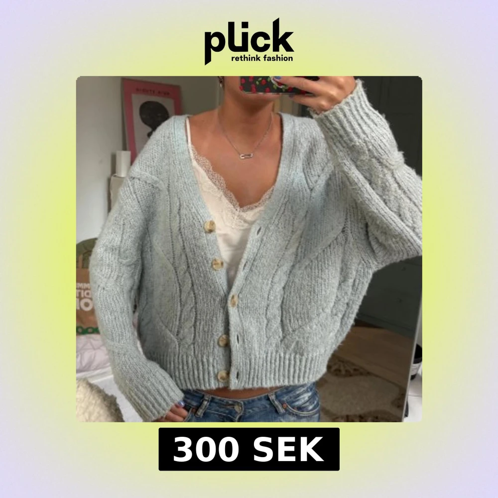 Supermysig ljusblå stickad kofta med grova flätstickade detaljer och stora träknappar framtill. Koftan har en loose passform, v-ringning och långa ärmar. Perfekt att slänga över en topp för en chill och snygg look.