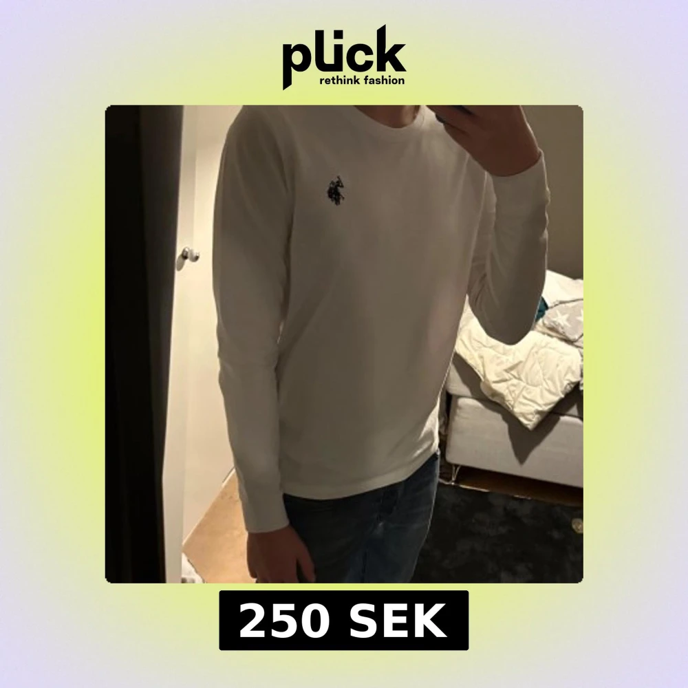 Säljer en stilren vit långärmad tröja från Ralph Lauren med den klassiska loggan broderad på bröstet. Tröjan har rund hals och är gjord i mjuk bomull, perfekt för dig som gillar enkel och clean stil. Endast testad