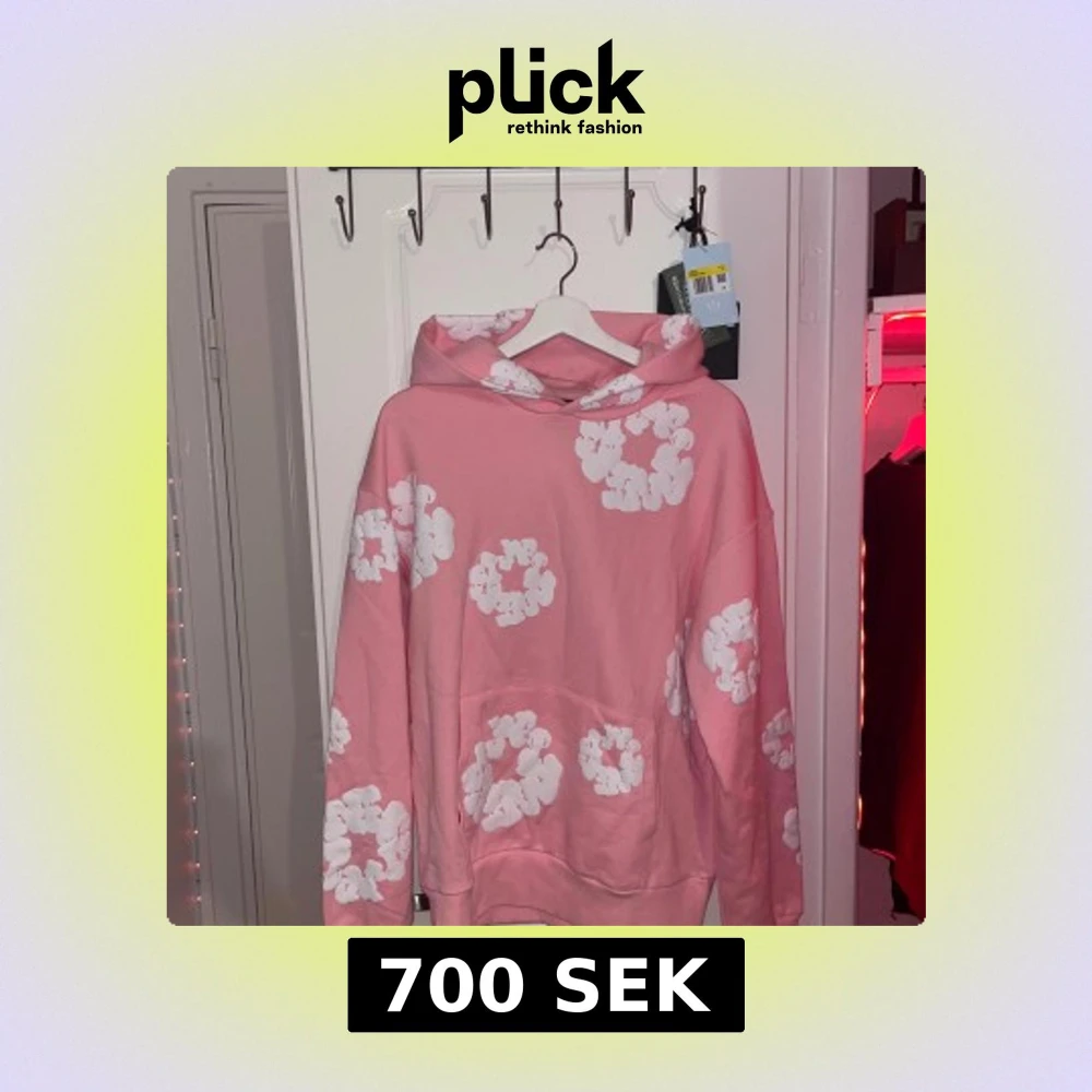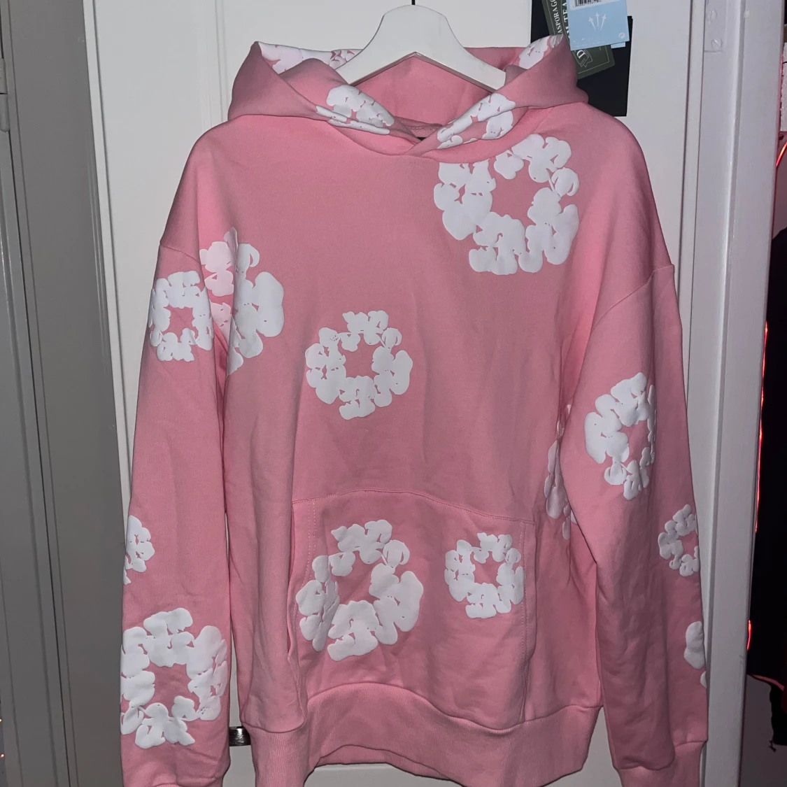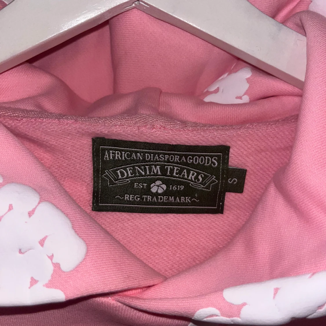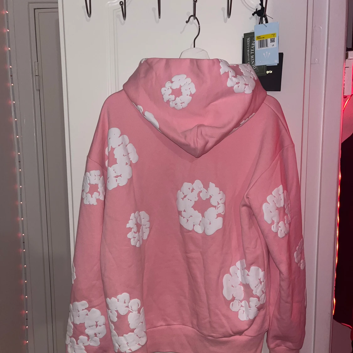Säljer en rosa hoodie från Denim Tears med vita blommor tryckta över hela tröjan. Tröjan har huva och en stor magficka framtill. Perfekt för dig som gillar färg och unika prints!