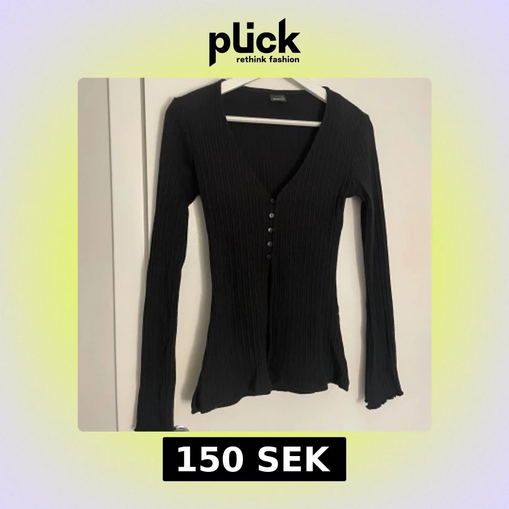 Snygg, svart ribbad tröja med knappar framtill. Från Gina. Stretchig. Aldrig använd