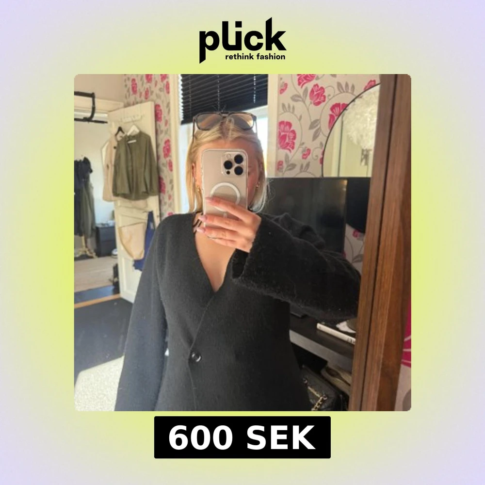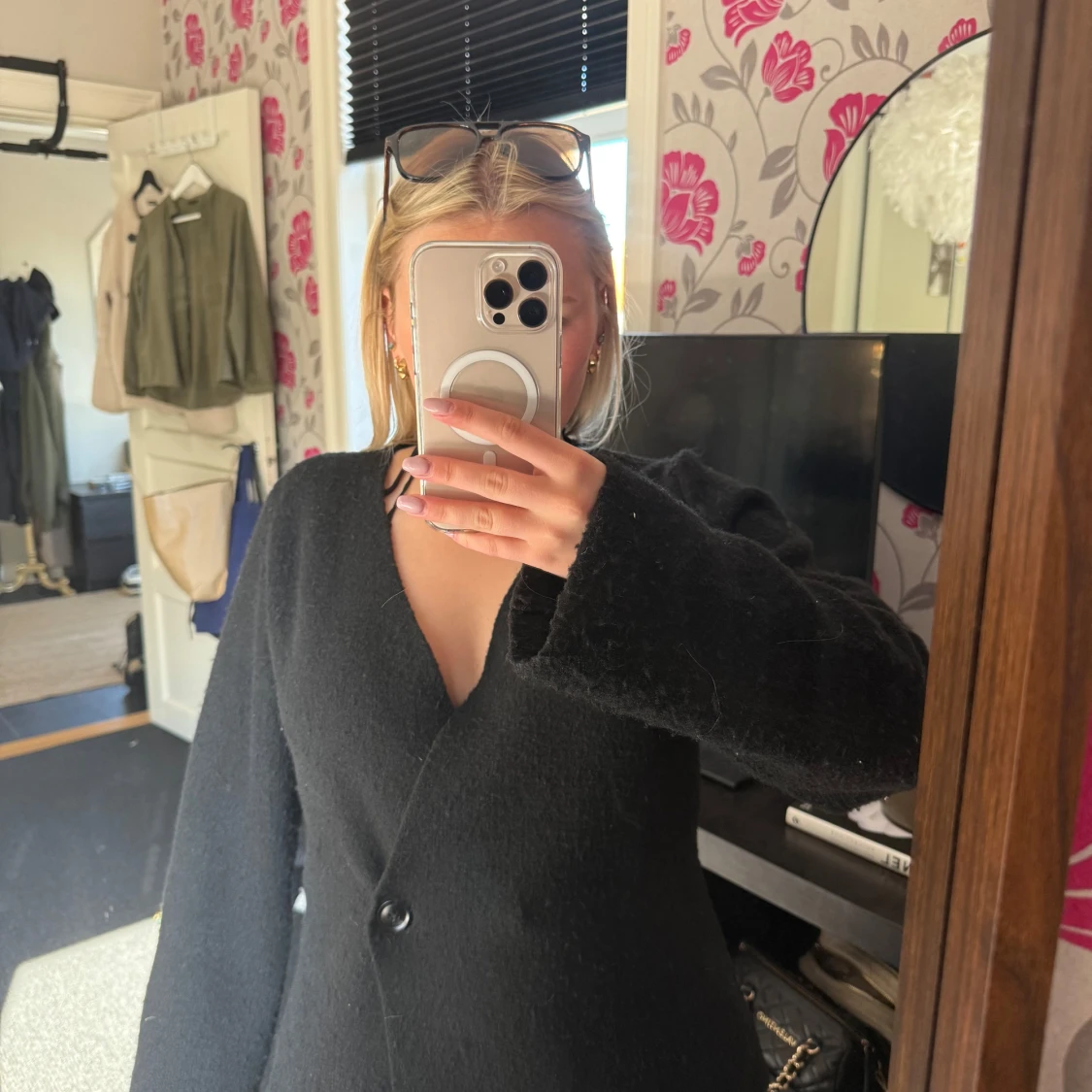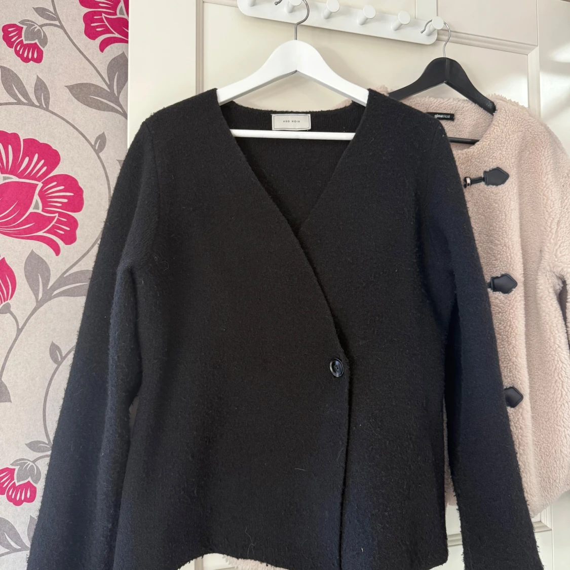 Säljer en svart kofta i ullblandning från neo noir. Koftan har en enkel, stilren design med v-ringning och en knapp framtill. Långärmad och passar perfekt för kyligare dagar. Snygg och tidlös modell.
