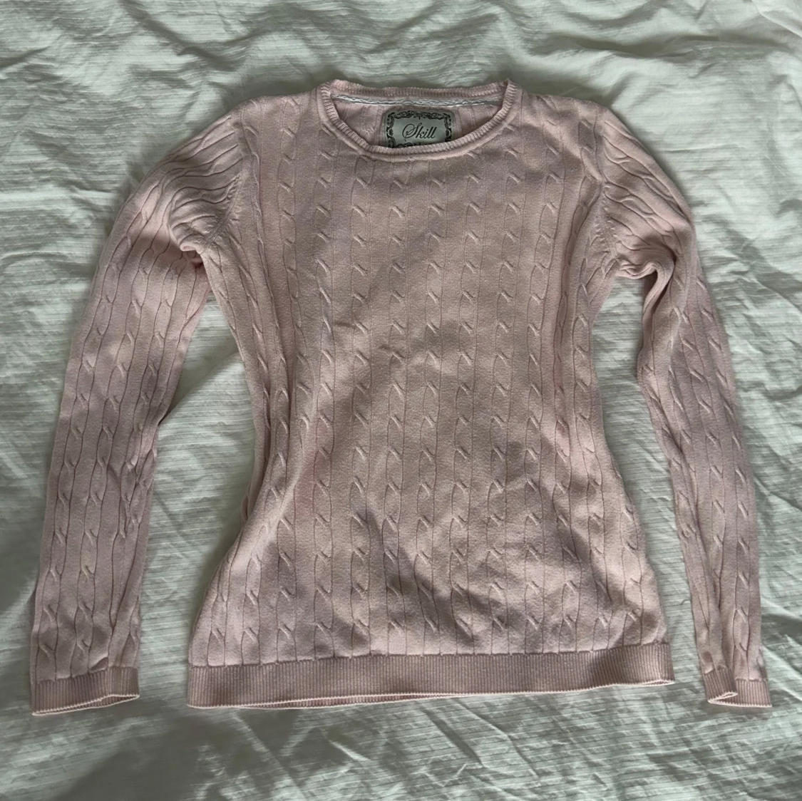 Säljer en ljusrosa stickad tröja med kabelstickat mönster. Tröjan har långa ärmar och en rund halsringning.