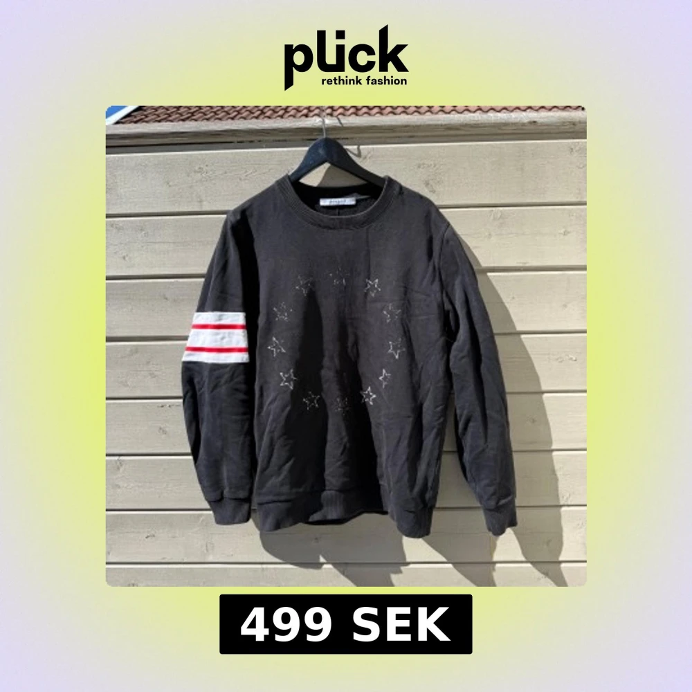 Säljer en svart sweatshirt från Givenchy med broderade vita stjärnor på bröstet och två röda ränder på ena ärmen. Tröjan har rund halsringning och ribbade muddar vid ärmslut och nederkant. Köpt ifrån Viaggio Club, så garanterat äkta!