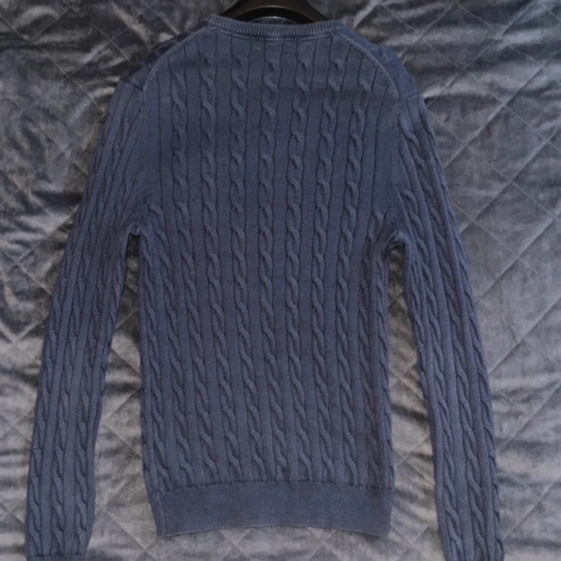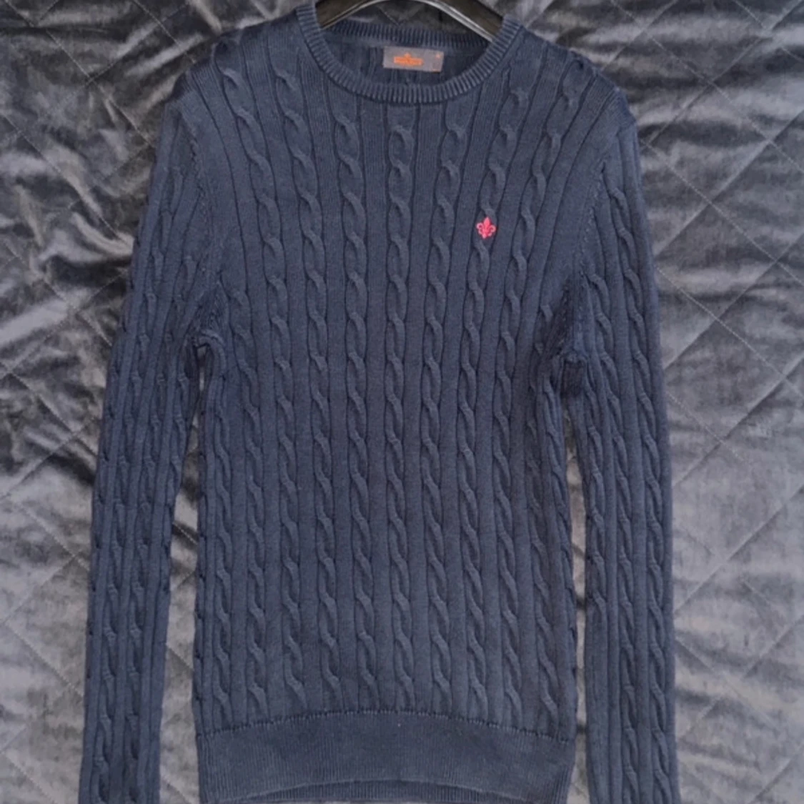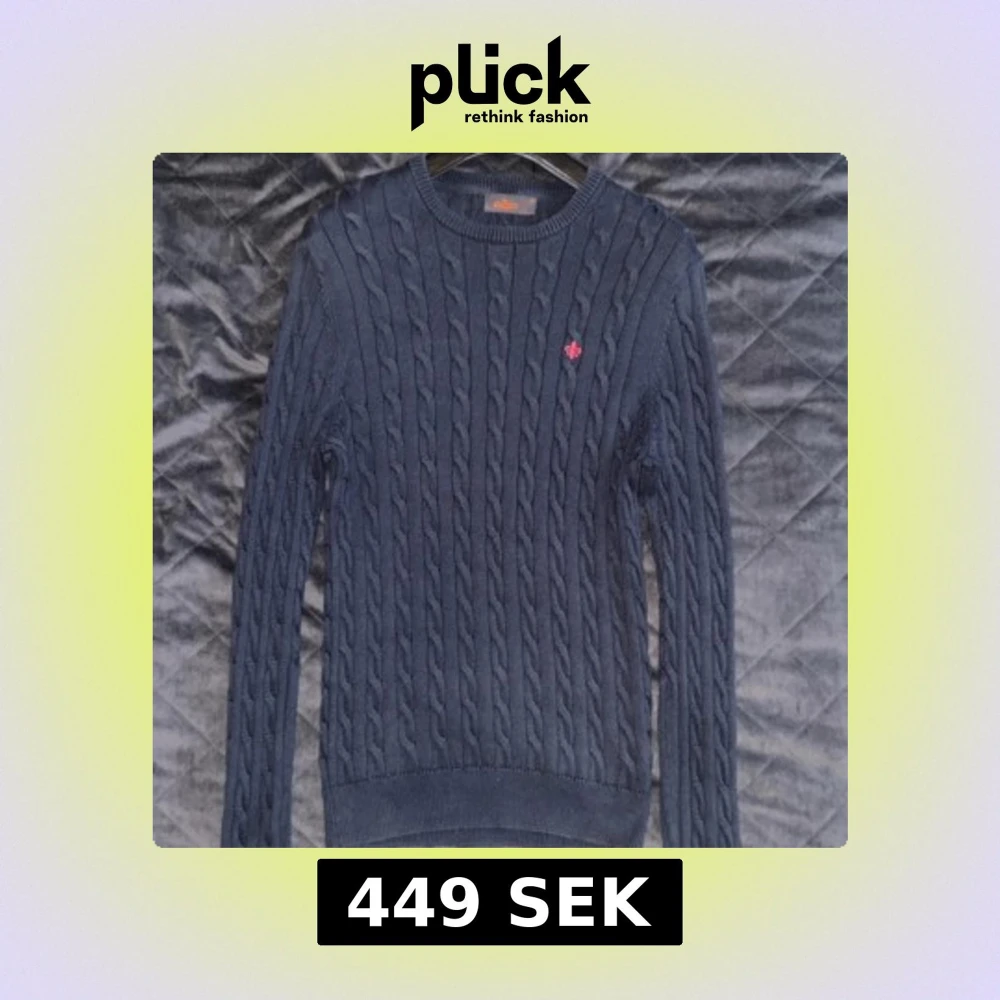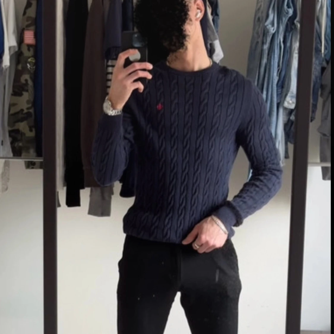 Säljer en stilren mörkblå kabelstickad tröja med en liten röd logga på bröstet. Tröjan har långa ärmar och en rund halsringning. Perfekt för kyligare dagar. Modellen på bild 3 är cirka 190. Priset kan diskuteras!